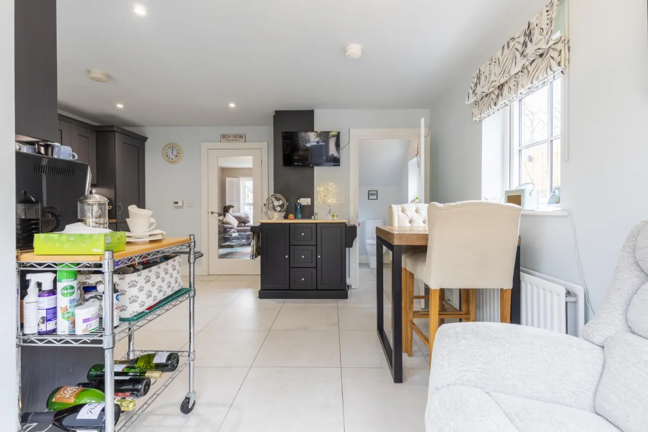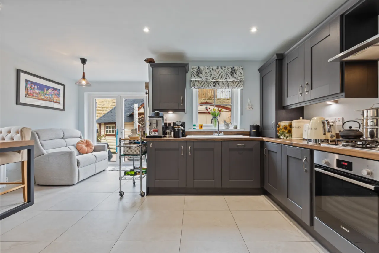 White enamel single drainer sink unit with mixer taps, dark grey shaker style units, wood effect Formica roll edge work surfaces, 4 ring gas hob unit, built in oven, stainless steel splashback and extractor hood, integrated fridge freezer, dishwasher and washing machine, larder cupboard, concealed lighting, concealed gas boiler, ceramic tiled floor, LED recessed spotlighting, uPVC double glazed French doors to rear landscaped garden.