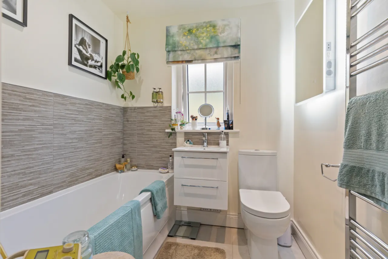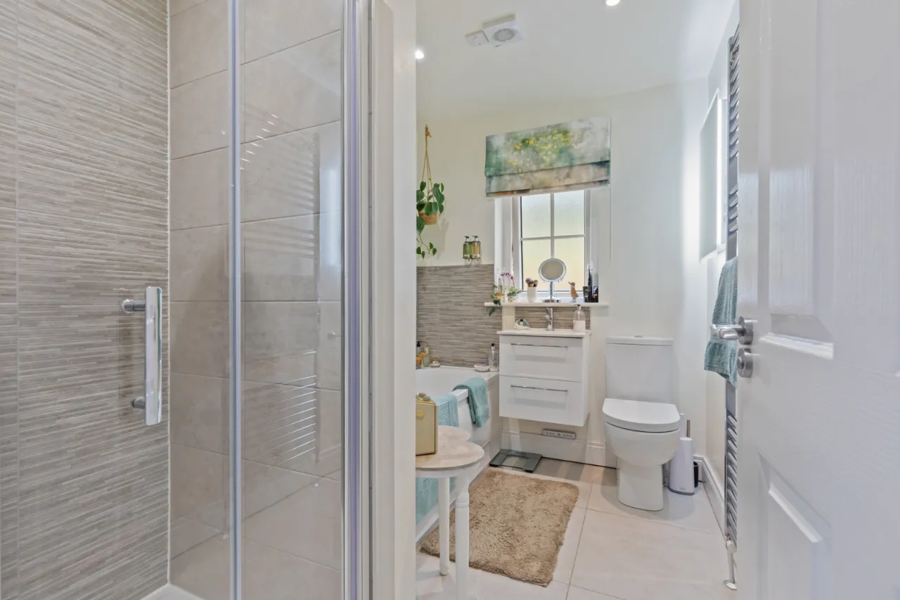 Modern white suite comprising: Panelled bath with mixer taps and telephone hand shower over bath, separate fully tiled shower cubicle with thermostatically controlled shower, rain head and telephone hand shower, floating high gloss vanity sink unit with mixer taps, push button WC, large chrome towel radiator, wall tiling, ceramic tiled floor, LED recessed spotlighting, extractor fan, wired for wall mounted mirror.