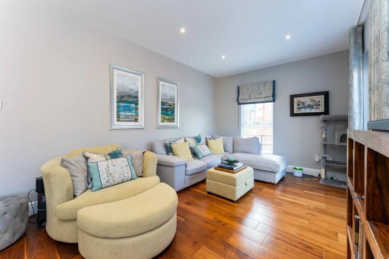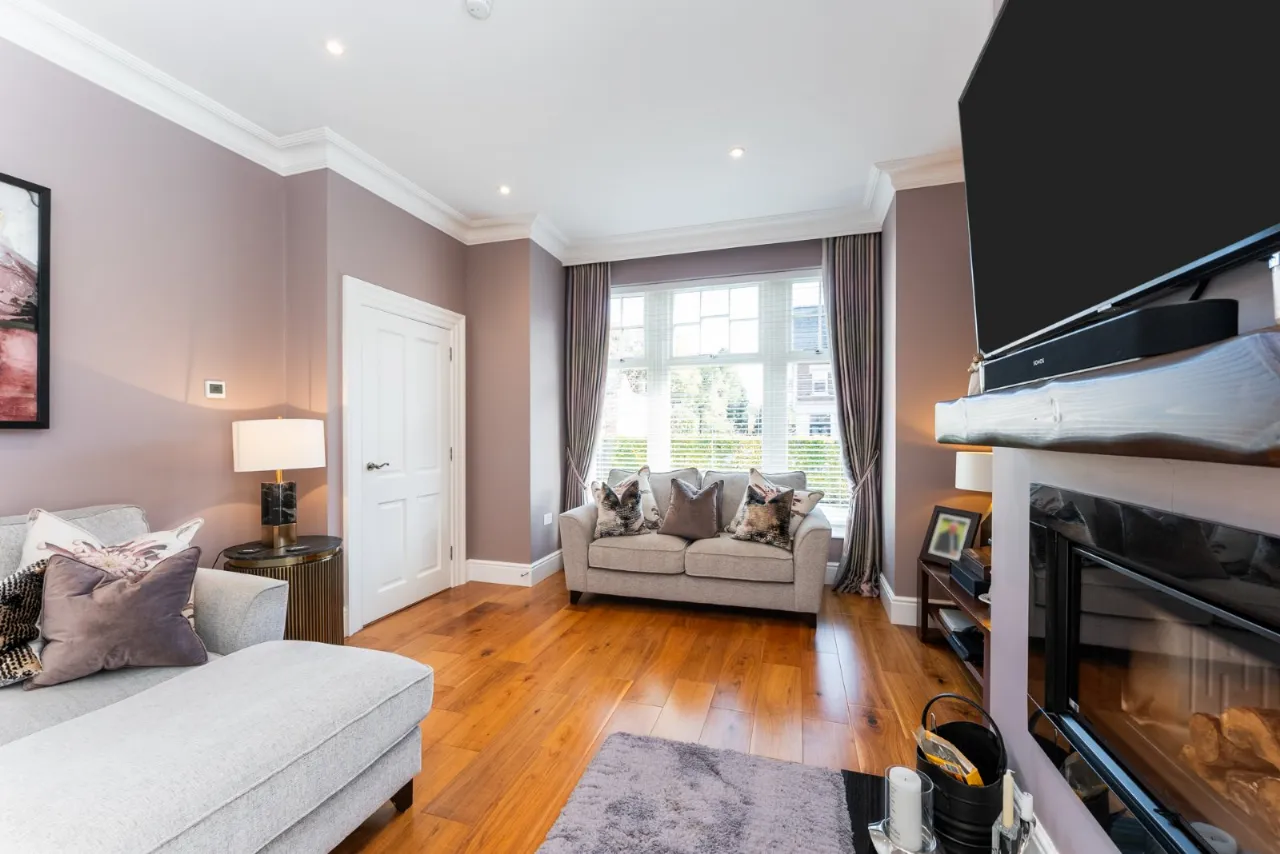 Cornice ceiling, spotlighting, bay window, cassette style wood fire, solid wood mantle, solid wood floor