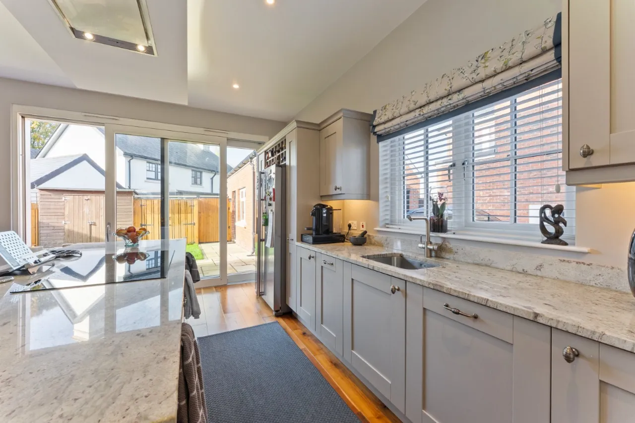 Spotlighting, range of high and low level units, stainless steel sink, space for American fridge freezer, space for wine fridge, integrated dishwasher, pull out bin, NEFF double electric oven, NEFF ceramic hob, extractor fan, double uPVC doors to outside and sliding doors leading outside