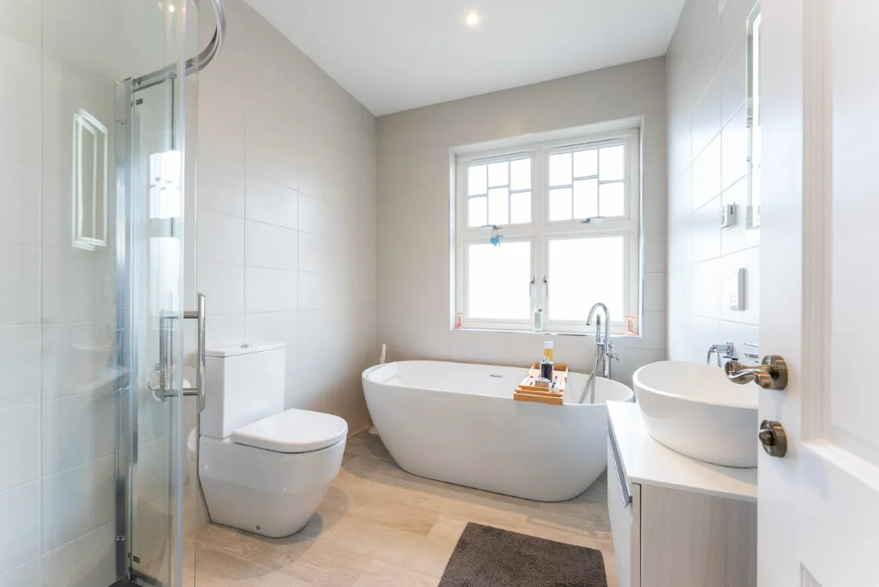 Low flush WC, pedestal wash hand basin, fully tiled corner shower cubicle with rainhead above, free standing bath with telephone hand shower, spotlighting, extractor fan
