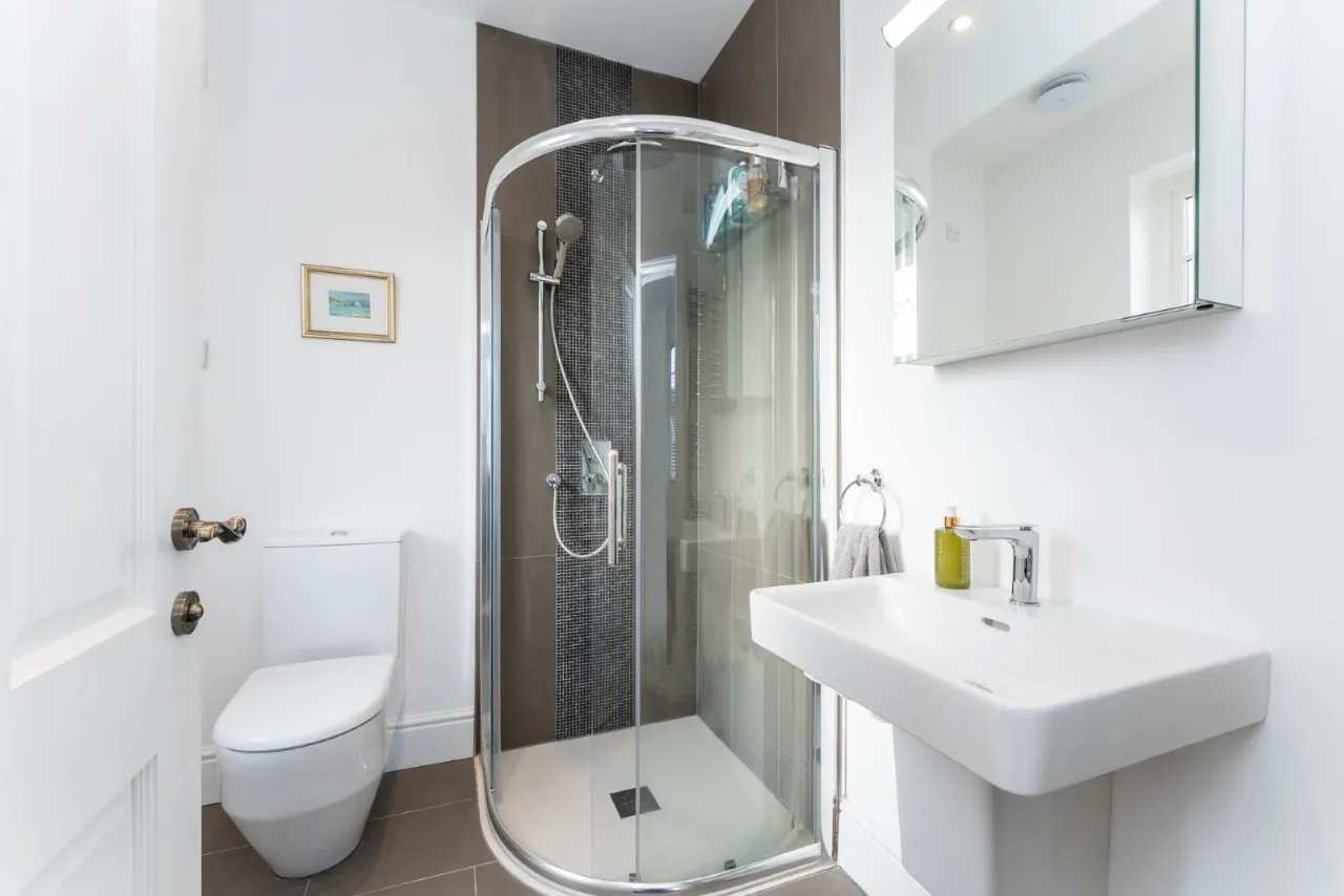 Low flush WC, pedestal wash hand basin, double shower with rainhead above