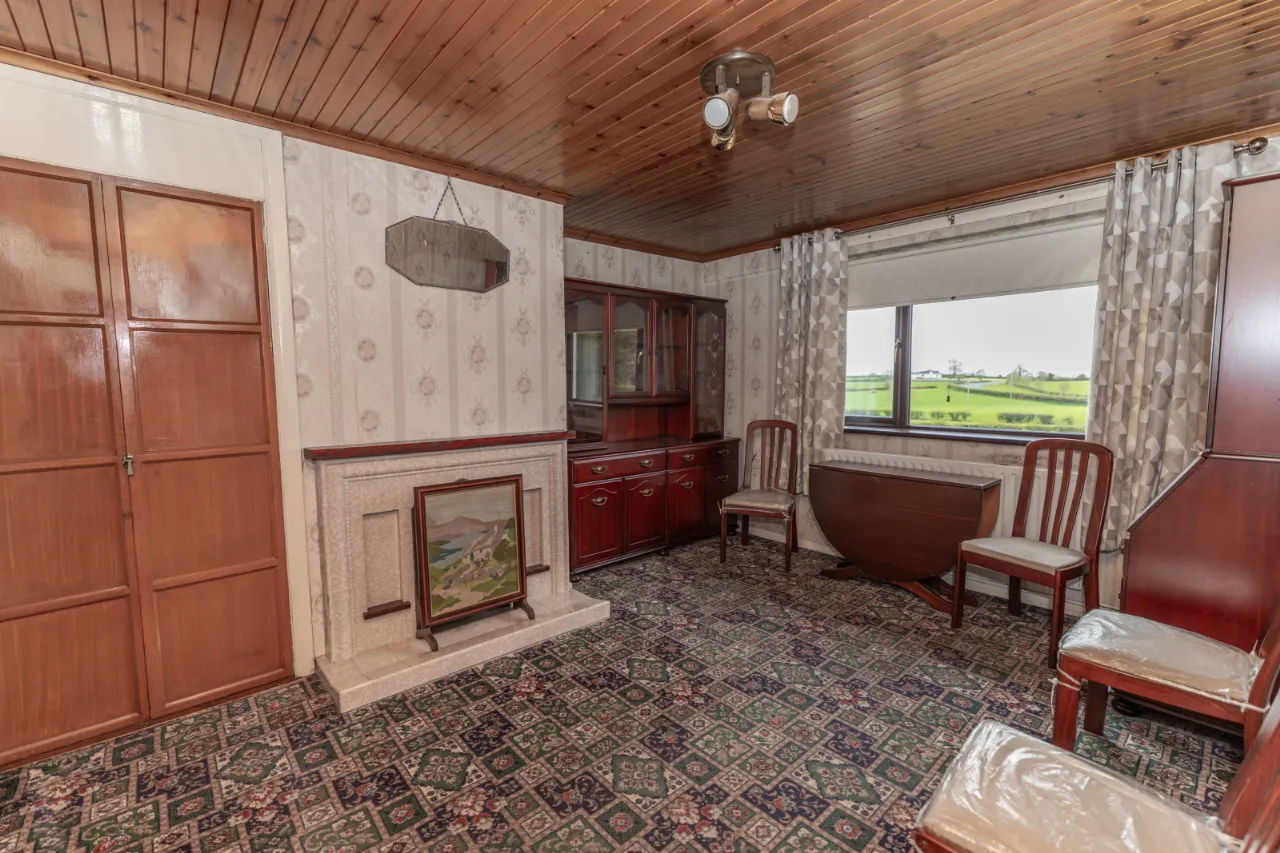 Front-facing reception room with carpet flooring, featuring an open fire with back boiler, cast iron insert, tiled surround, and wooden mantle above. Double radiator, TV point, and hot press in the corner with insulated tank and shelving overhead.