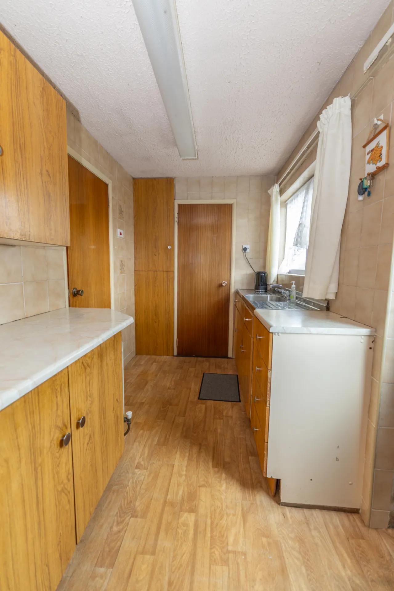 Range of upper and lower units with tiled splashback, stainless steel sink with drainer, laminate worktops, and plumbed for washing machine.