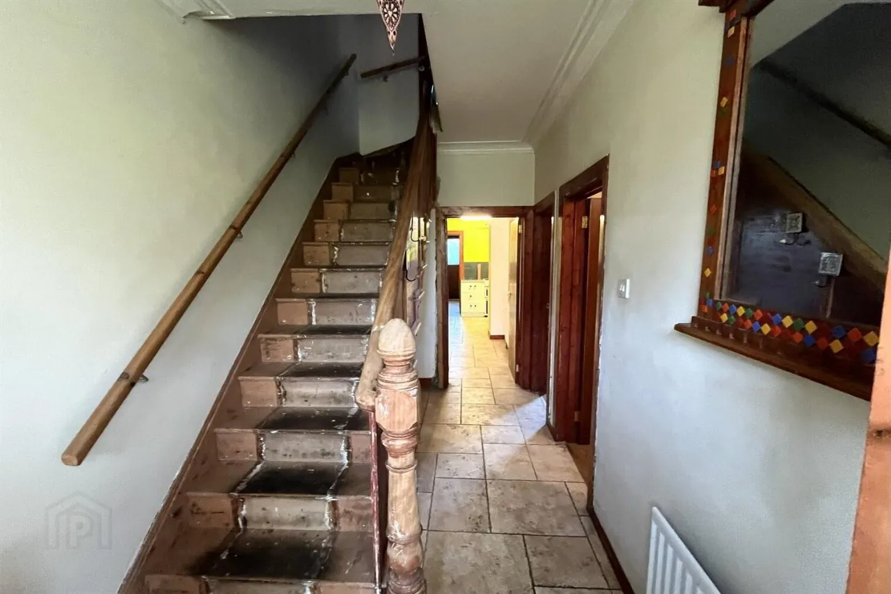 Laminated timber, double panelled radiator, fire place with tiled hearth.