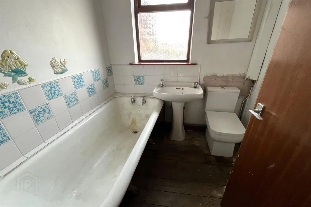 Partially tiled walls, white suite comprising, w.c., metal bath, pedestal wash hand basin, single panelled radiator.