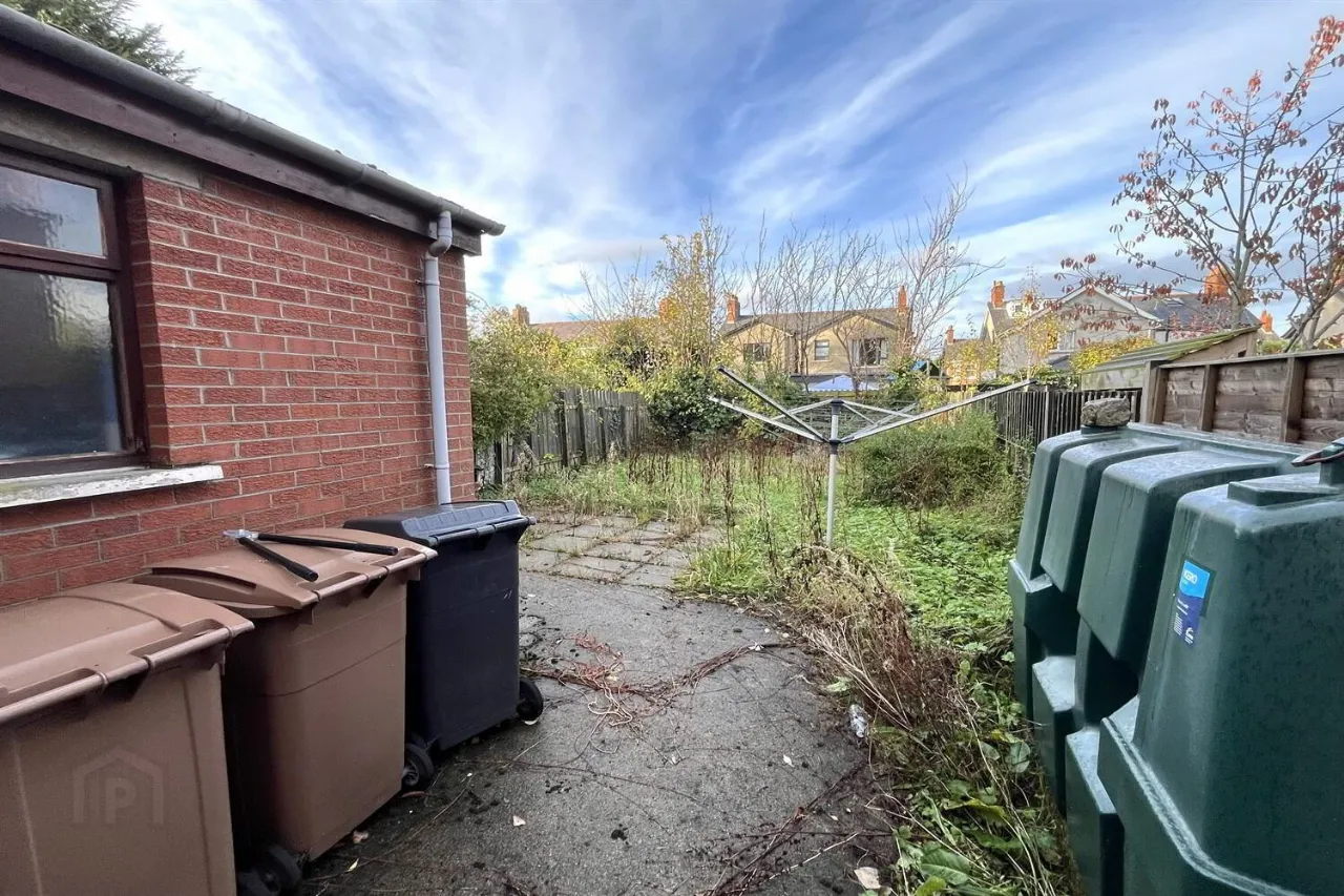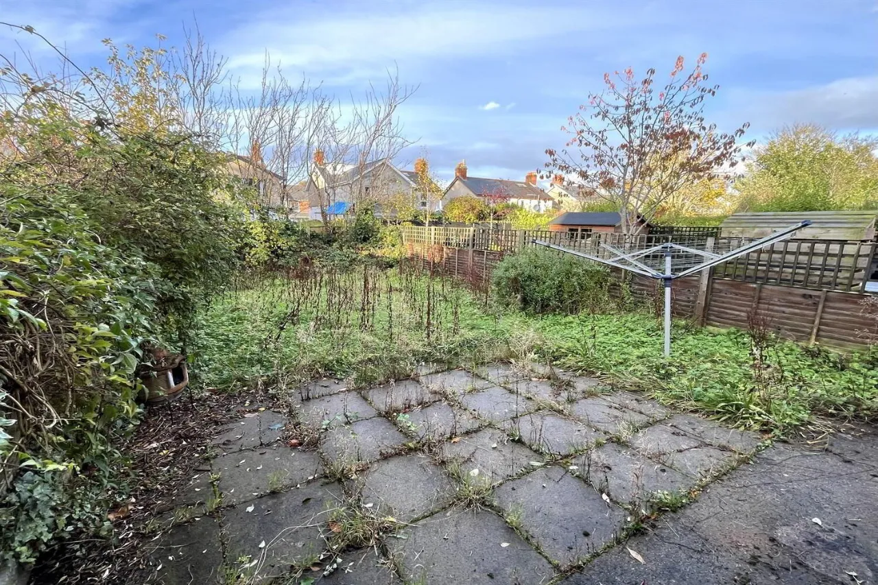 Front: metal railings and gate, driveway, mature planting. Rear: enclosed garden, concrete paving, oil tank, boiler house containing oil fired boiler.