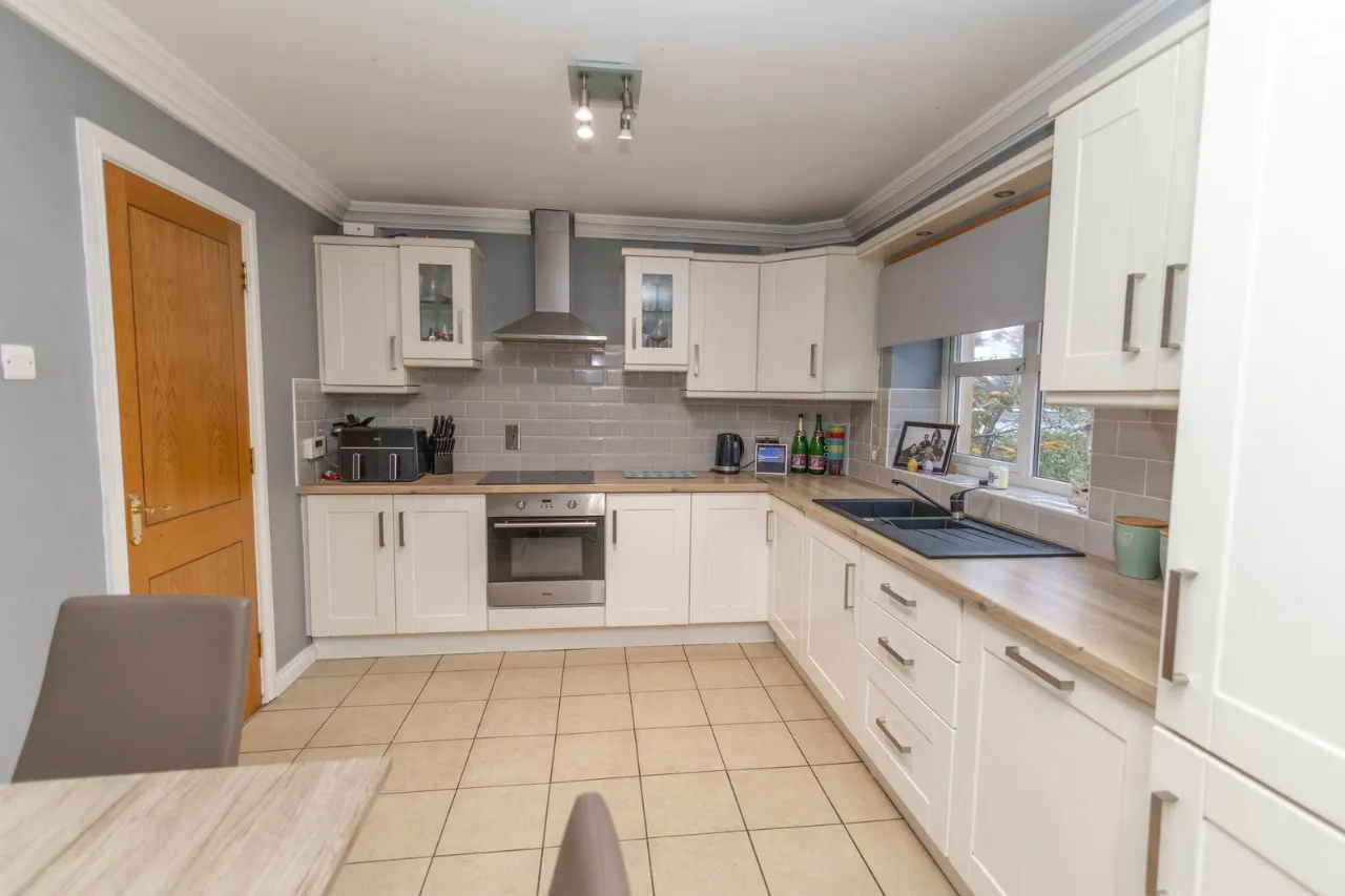 Tiled flooring. Partially tiled walls. High and low painted kitchen units. Integrated dishwasher. Electric oven and hob. Stainless steel extractor fan. Decorative radiator cover. Patio doors leading to external area.