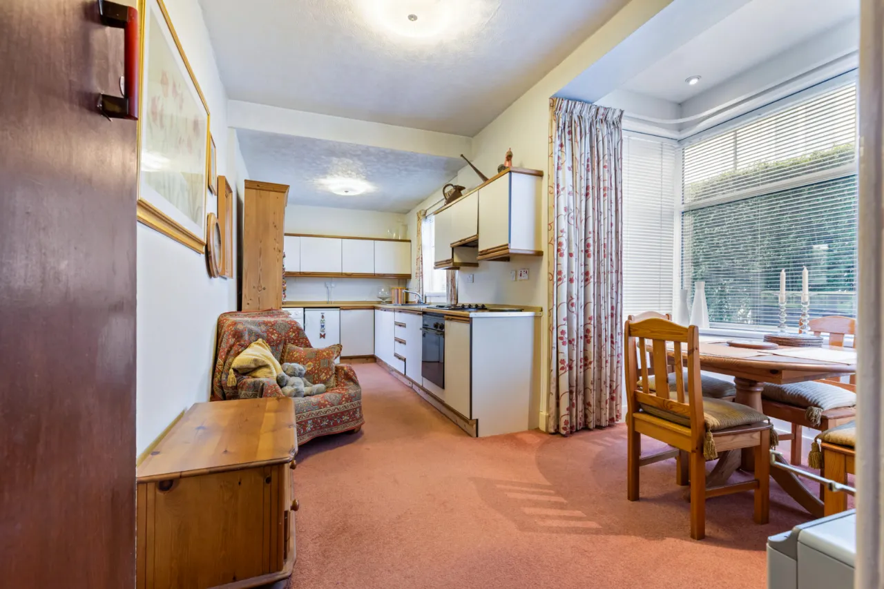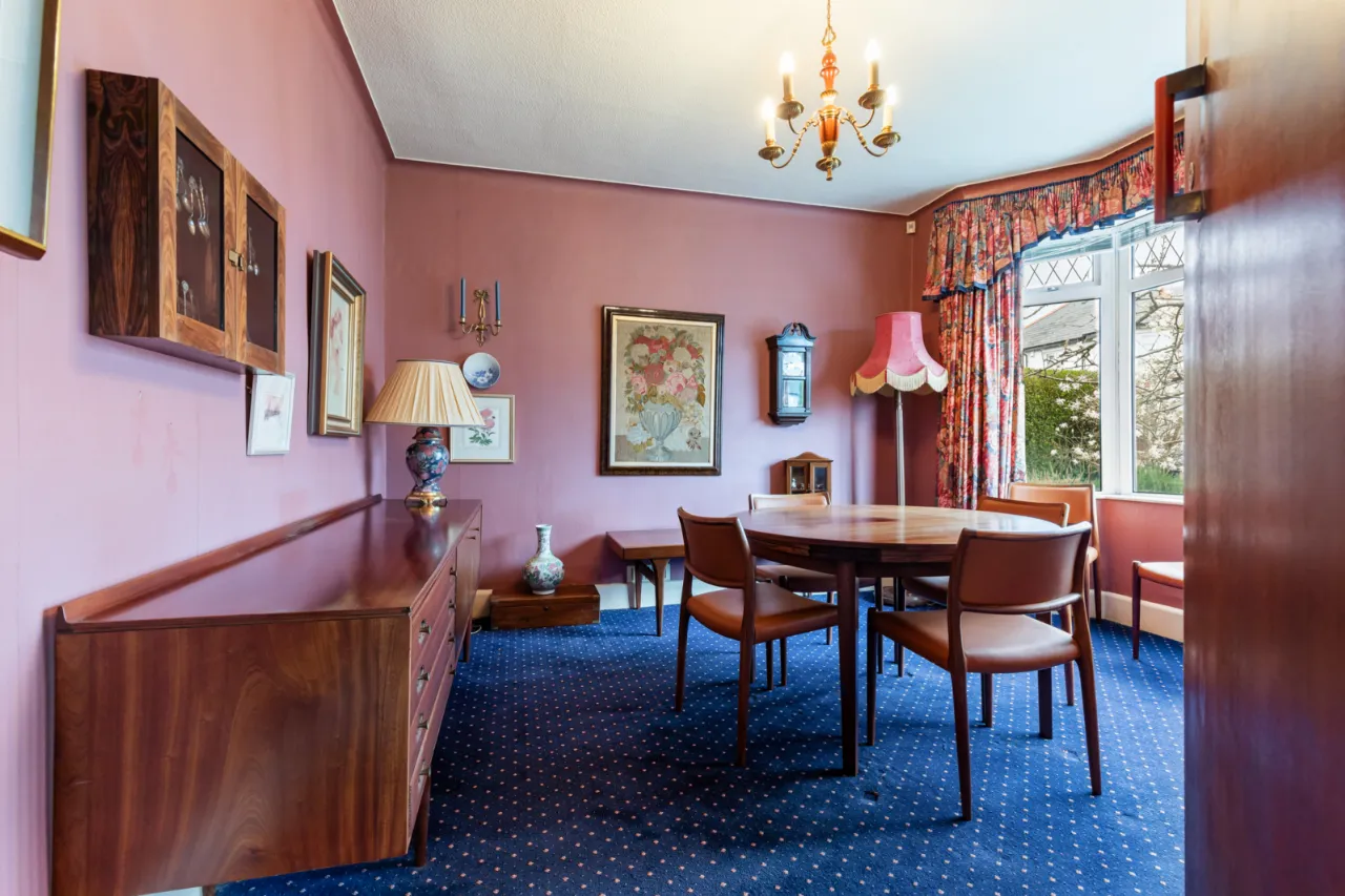 The property provides well-proportioned accommodation throughout, including a bright living room with open fire, a separate dining room with attractive bay window, and a kitchen which has been extended into a dining area, creating a practical space for everyday living. A convenient cloakroom with WC completes the ground floor.