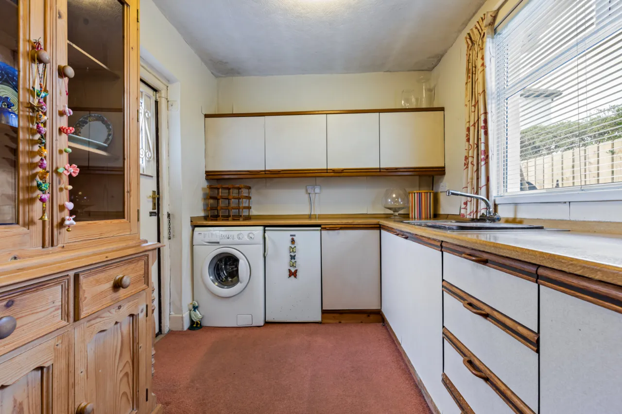 Full range of high and low level units, 4 ring hob and under oven, plumbed for washing machine, stainless steel single drainer sink unit with mixer taps.