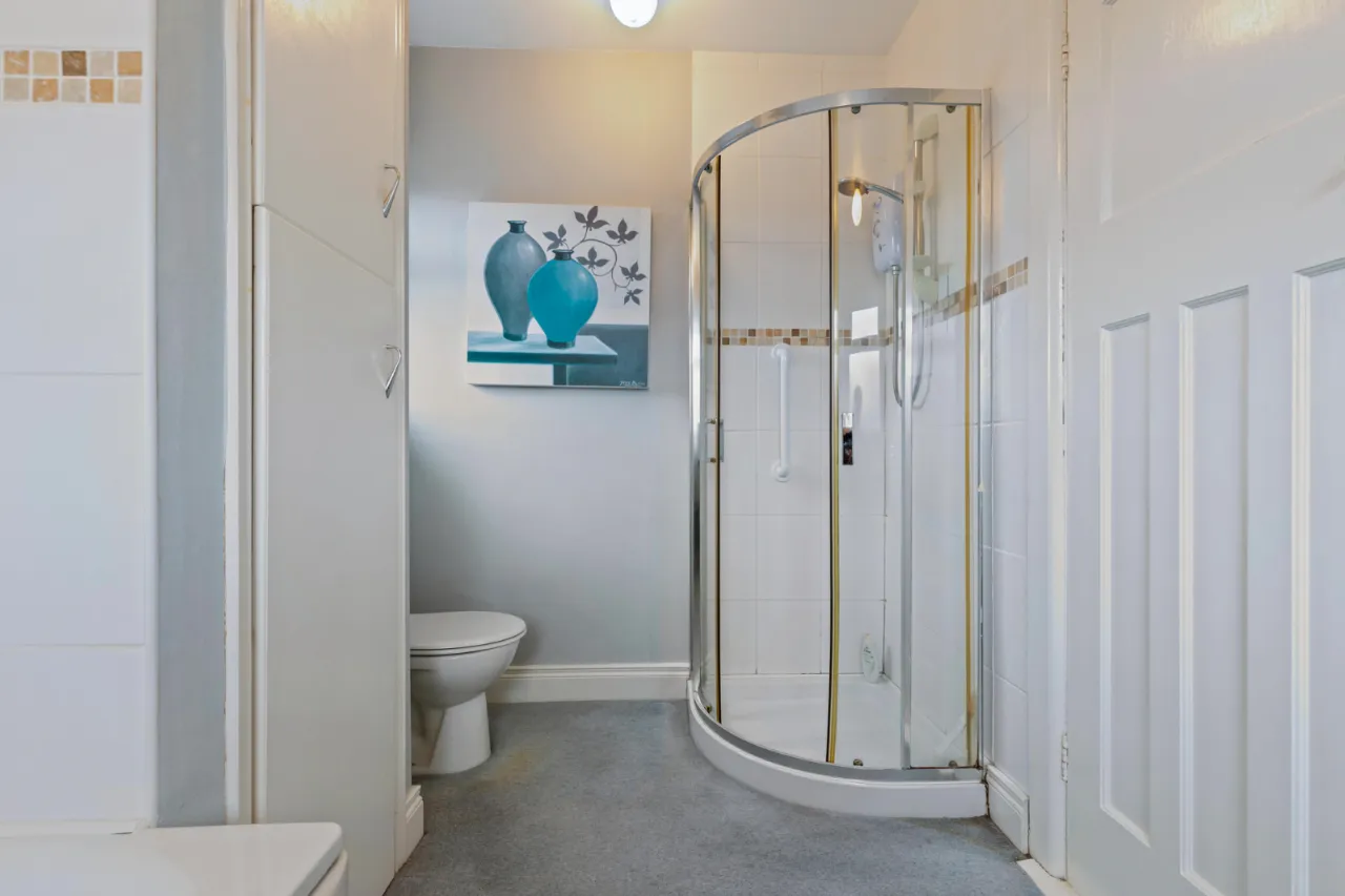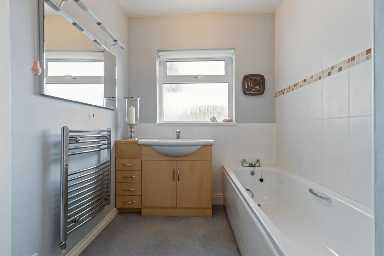 White suite comprising: Panelled bath with mixer taps, vanity sink unit with mixer taps, low flush WC, chrome towel radiator, fully tiled shower cubicle with instant heat electric shower, partly tiled walls.