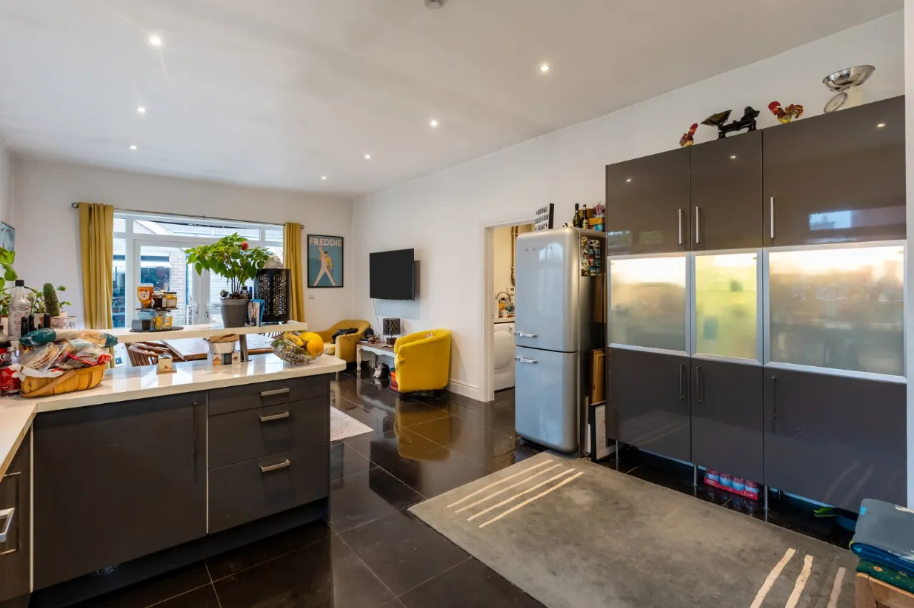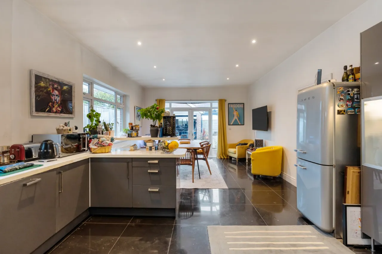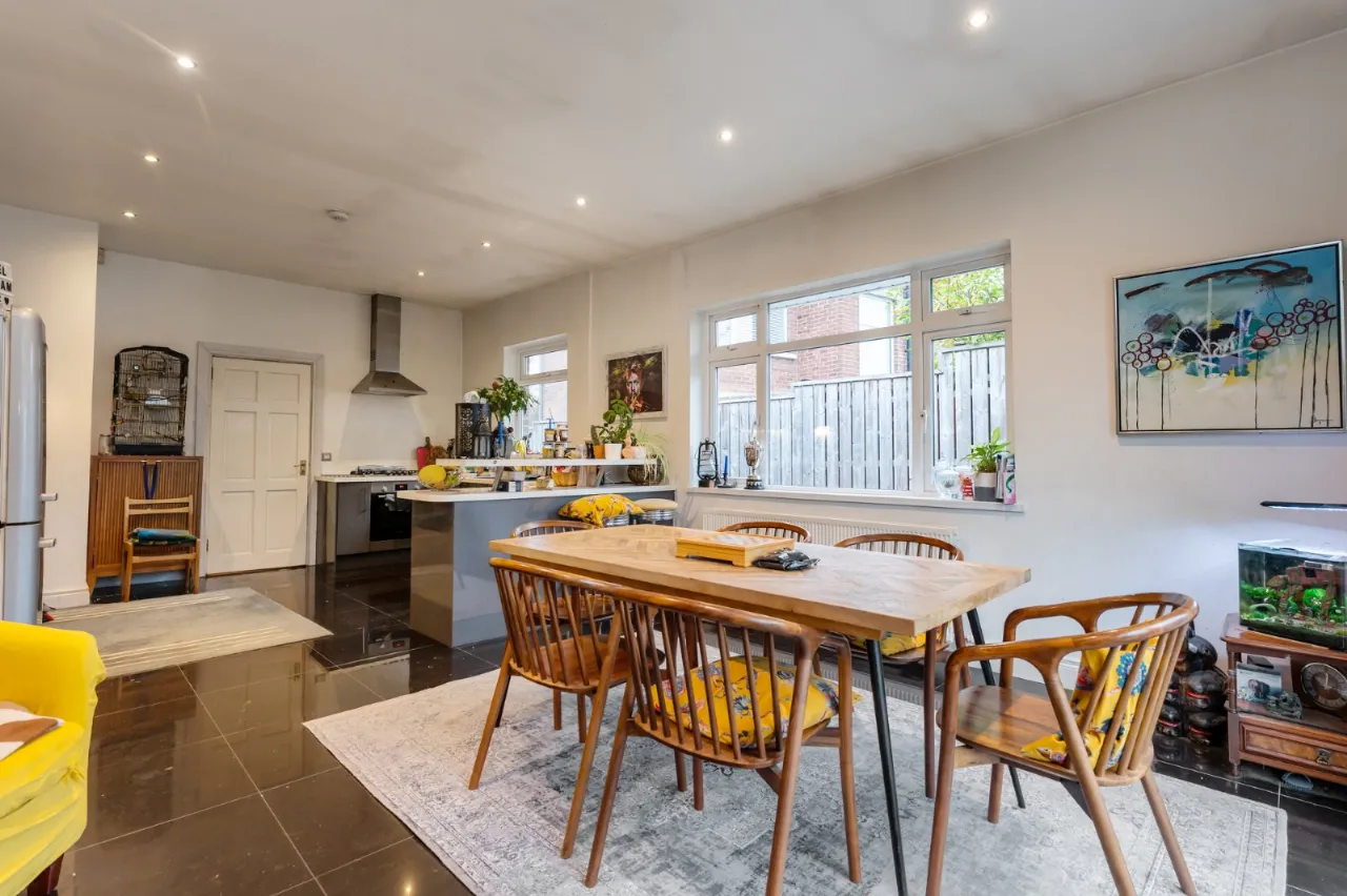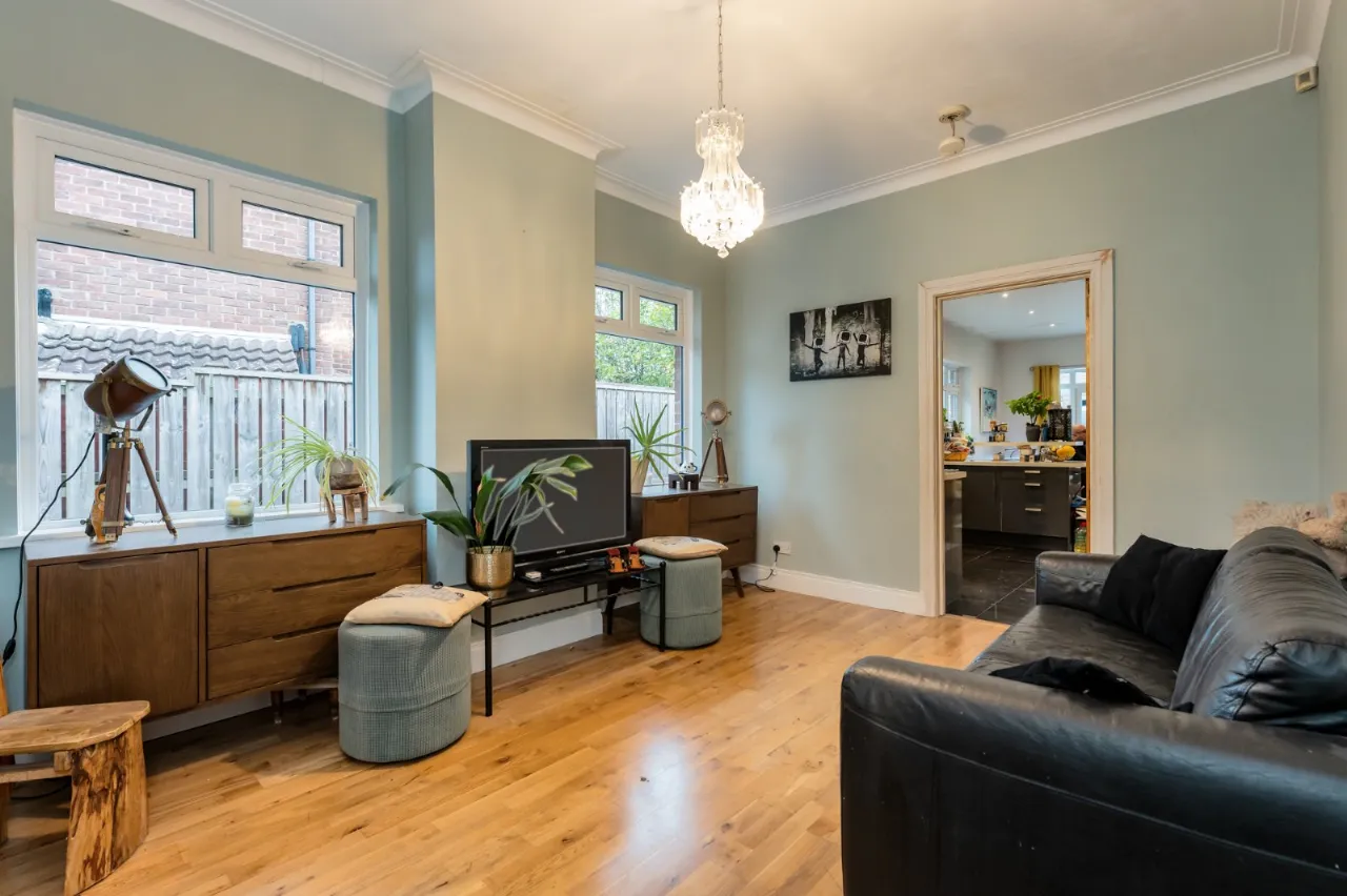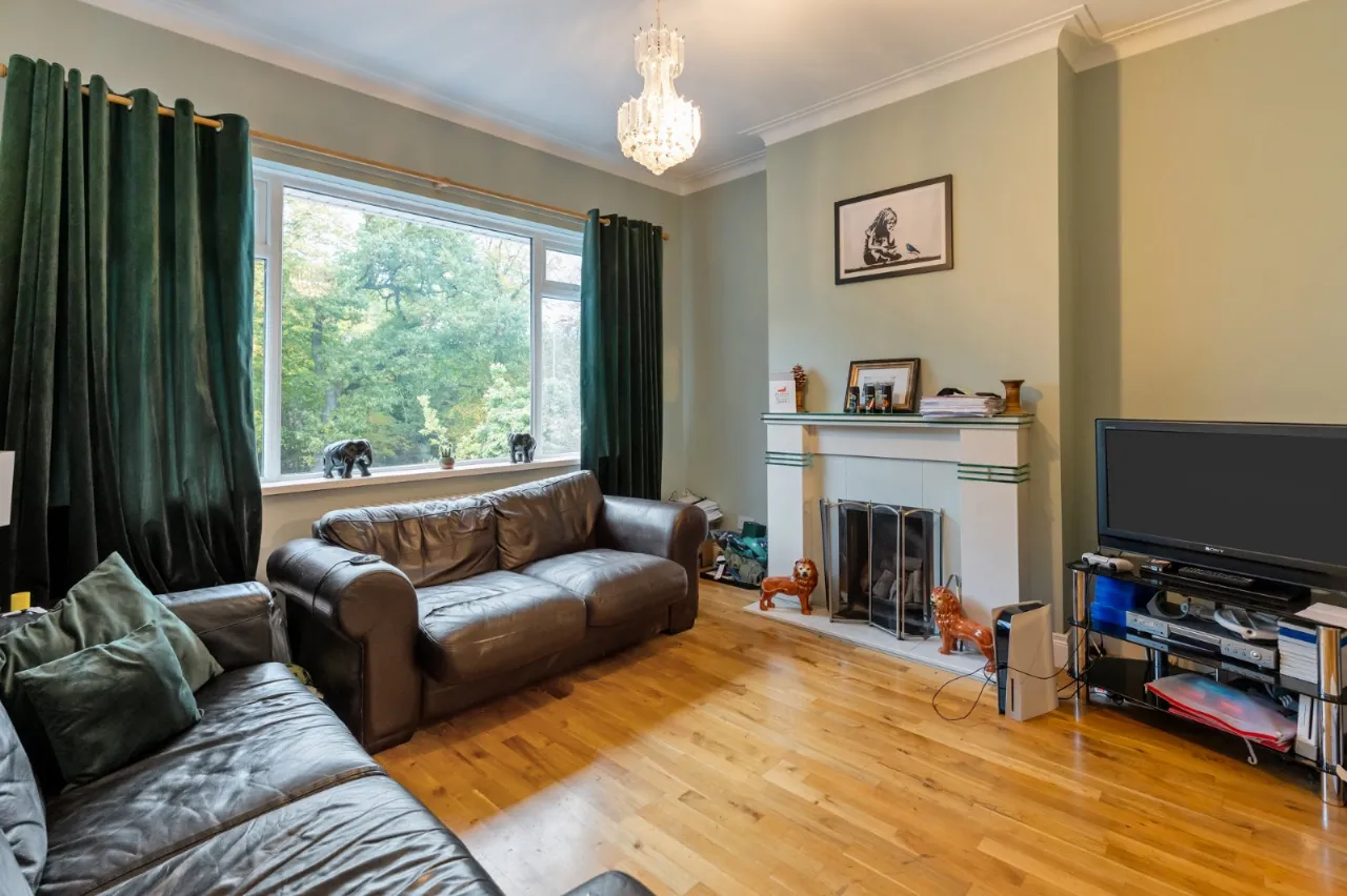 Cast iron fireplace with open fire, Junckers flooring, corniced ceiling.
