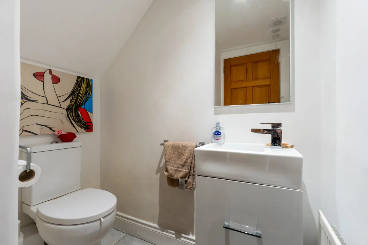 Low flush WC, vanity sink unit with mixer taps. Cloaks cupboard.