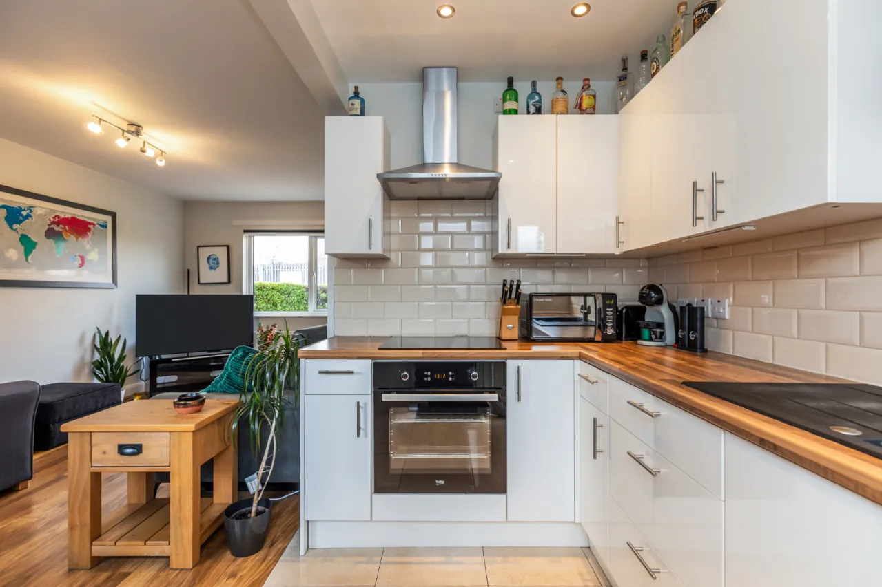 Gloss hand and low level units, laminate work surfaces with sink unit and drainer 1 tub with mixer tap, integrated Beko oven, four ring hot point electric hob above, stainless steel extractor fan, space for fridge freezer, partly tiled walls, tiled flooring, recessed spotlighting, access to rear garden. Living Dining Area with laminate wood effect flooring, dual aspect to front and rear.