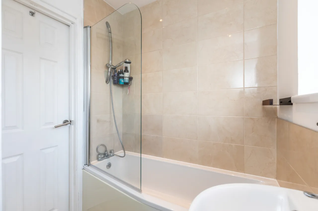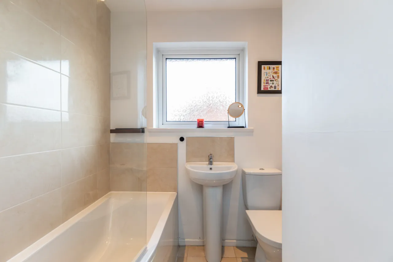 White suite comprising of low flush WC, pedestal wash hand basin with mixer tap, tiled splash back, paneled bath with hot and cold tap and handset, partly tiled walls, tiled flooring, recessed spotlighting, extractor fan, storage cupboard.