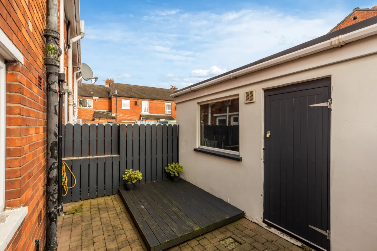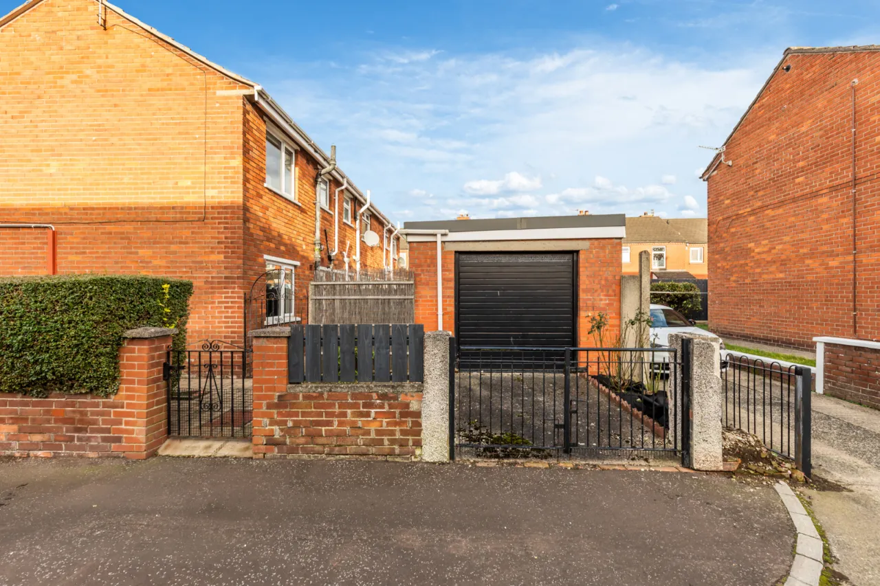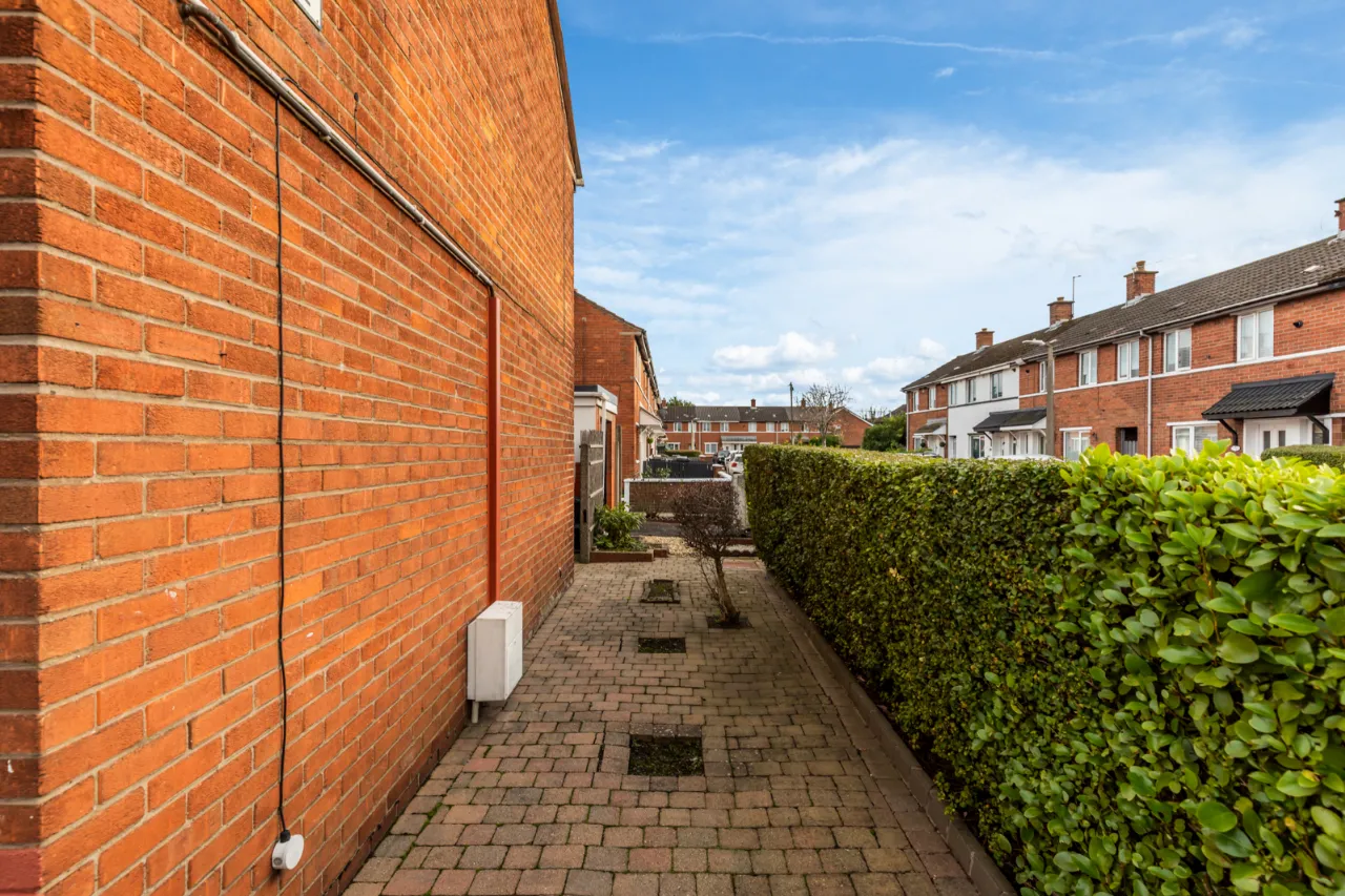 Paved patio, mature hedging to front. Side garden laid in brick paver, mature hedging, driveway.