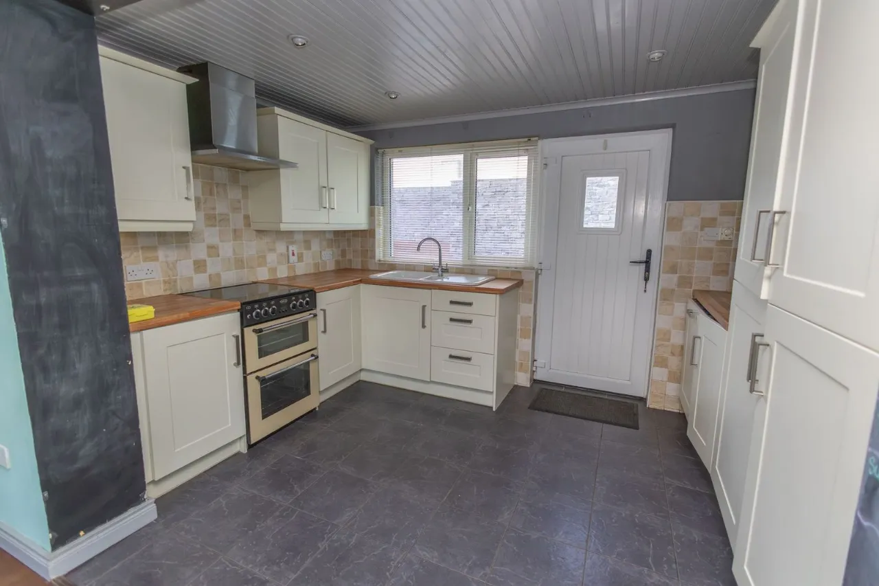 Tiled flooring. Partially tiled walls. Painted high and low units. Gas cooker and hob. Stainless steel extractor fan. Integrated dishwasher. Enamel sink