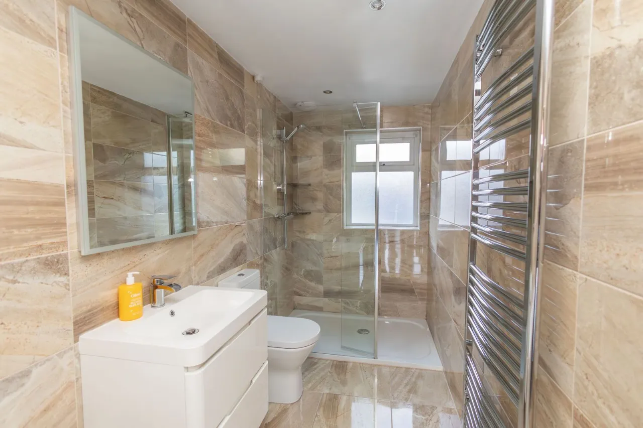 Tiled flooring. Fully tiled walls. Recessed lighting. Bath with chrome taps. Sink with vanity unit. Thermostat shower with glass panels. Low flush wc. Wall mounted chrome radiator.