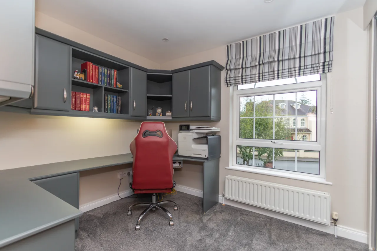 Located to the front of the property. Carpet flooring. Recessed lighting. Built in storage, desk top and shelves.