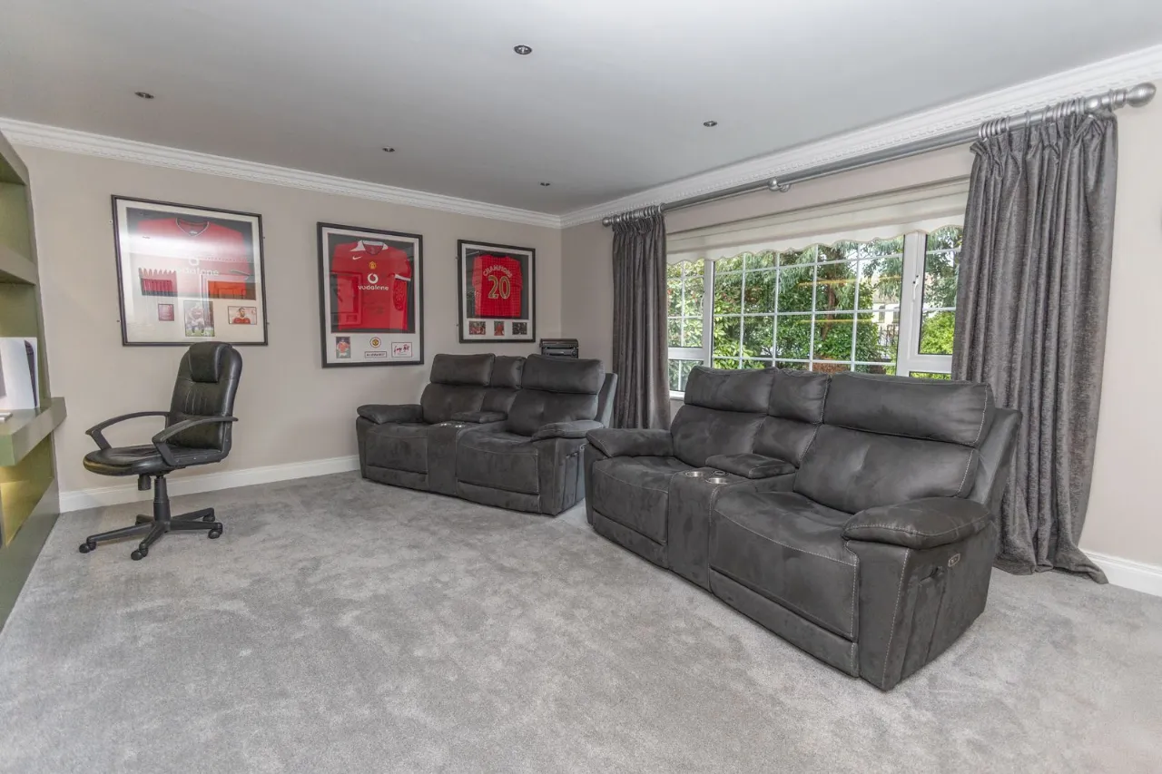 Carpet flooring. Recessed ceiling lights. Media wall with underlights and electric fire inset.