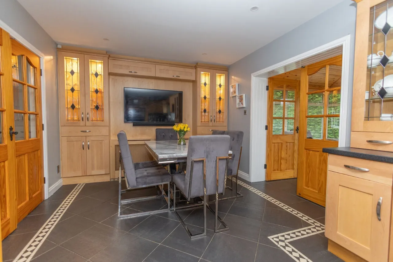 Tiled flooring with decorative border. Recessed ceiling lights. High and low solid wood kitchen units with display cabinets. 5 ring gas cooker. Electric ovens. Integrated deep fat fryer with extractor fan. American style fridge freezer. Integrated dishwasher. Instant boiling water tap. Double doors leading to sun room.