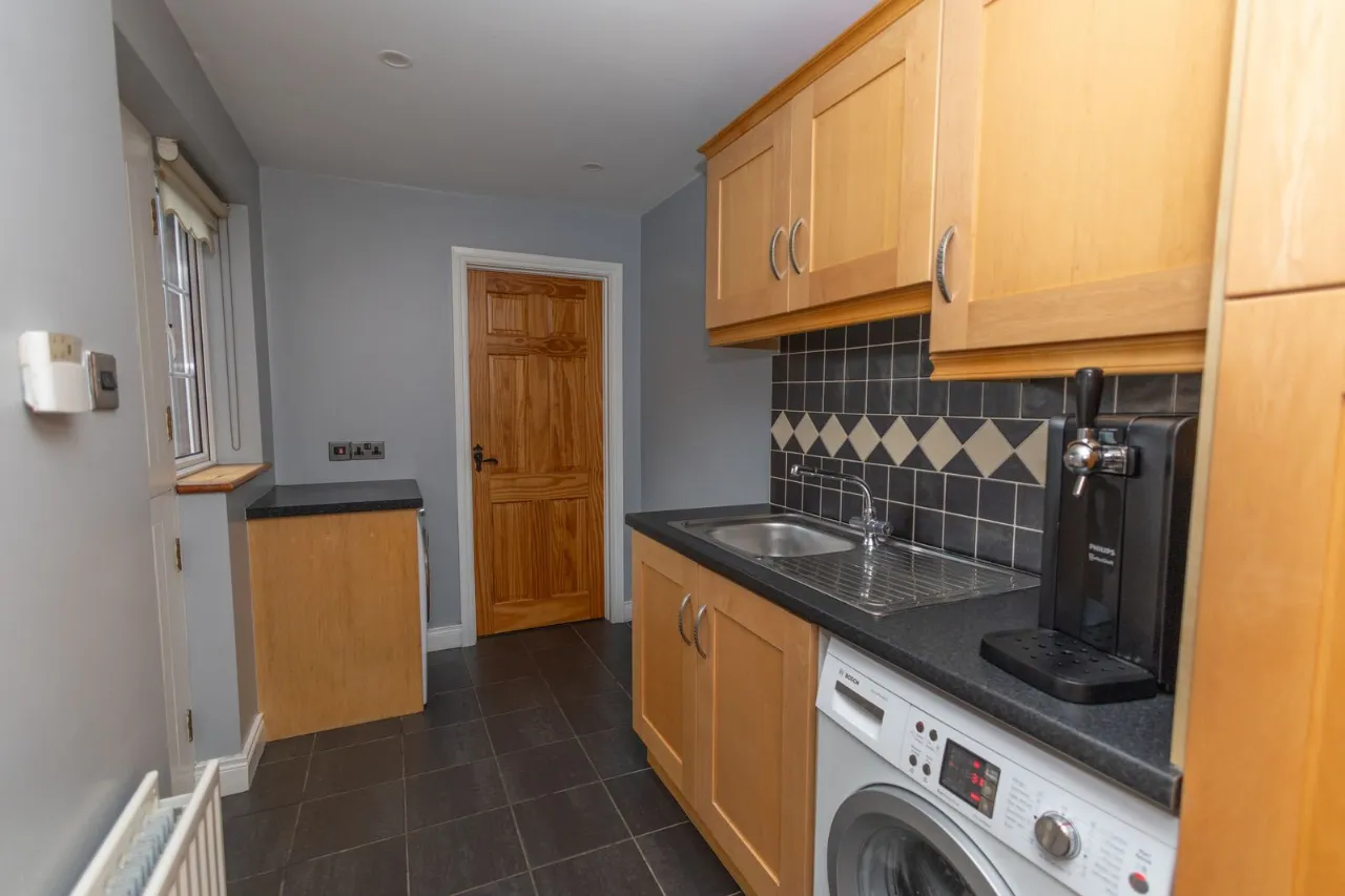 Tiled flooring. Recessed ceiling lights. Partially tiled walls. High and low kitchen units. Stainless steel sink. Plumbed for laundry. External stable door to rear of property.