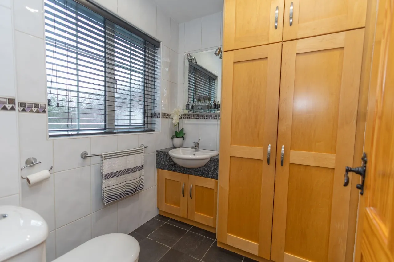 Tiled flooring. Fully tiled walls with decorative border. Low flush wc. Sink with vanity unit and wall mounted mirror with lights. Built in storage units.