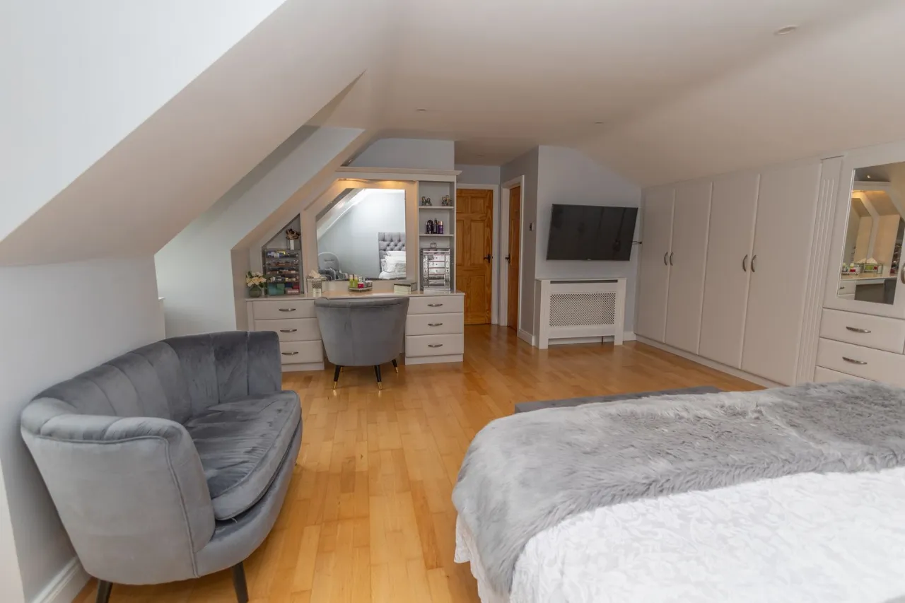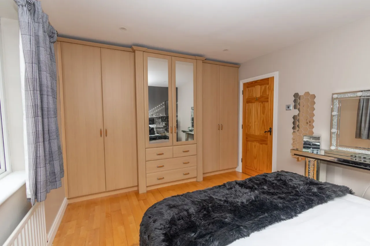 Located to the front of the property. Laminate flooring. Recessed ceiling lights. Built in wardrobes and storage. Vanity unit with drawers and mirror.