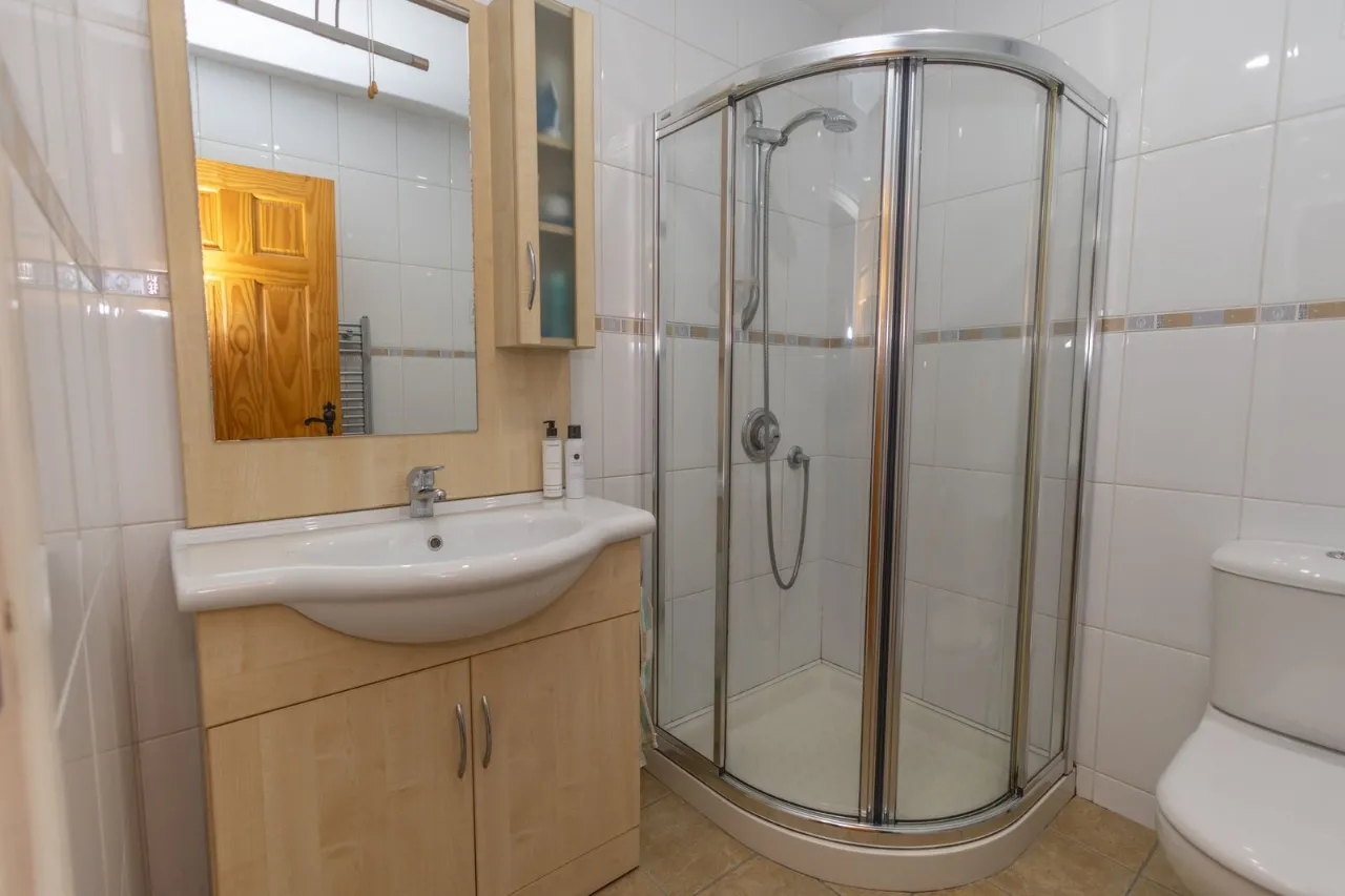 Tiled flooring. Recessed ceiling lights. Fully tiled walls with decorative border. vanity unit with sink, storage, mirror and light. Low flush wc. Quadrant shower unit with thermostat shower. Wall mounted chrome radiator.