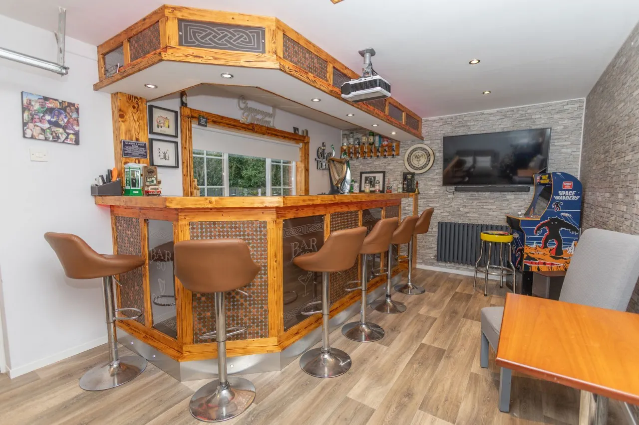 Converted to a home bar. Recessed ceiling lights. Vinyl flooring. Wooden bar counter. Garage roller door.