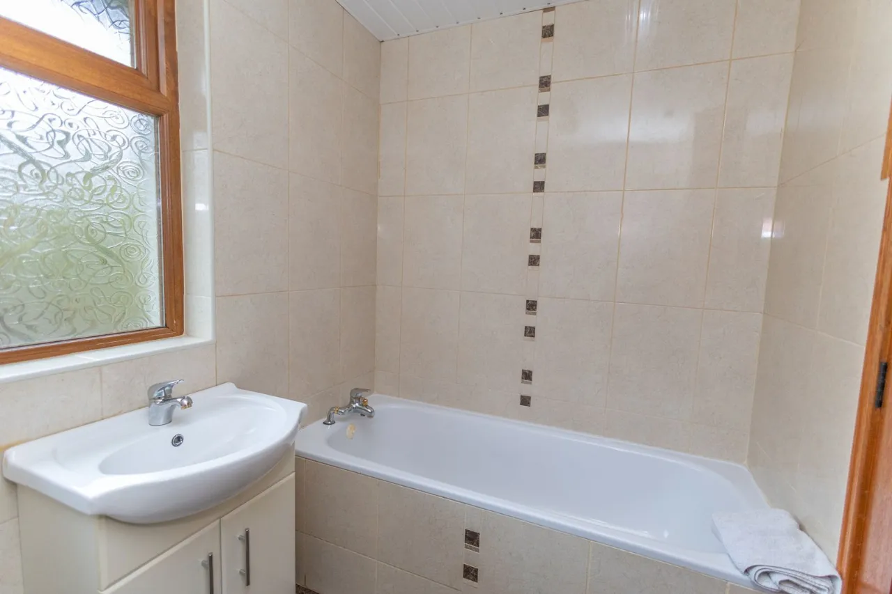 3 piece bathroom suite. Fully tiled flooring and walls. Single radiator