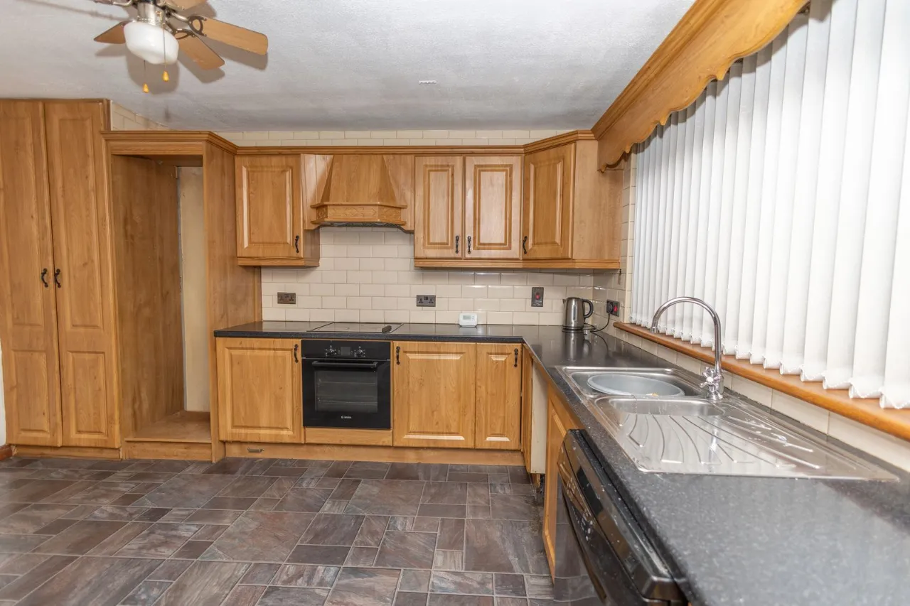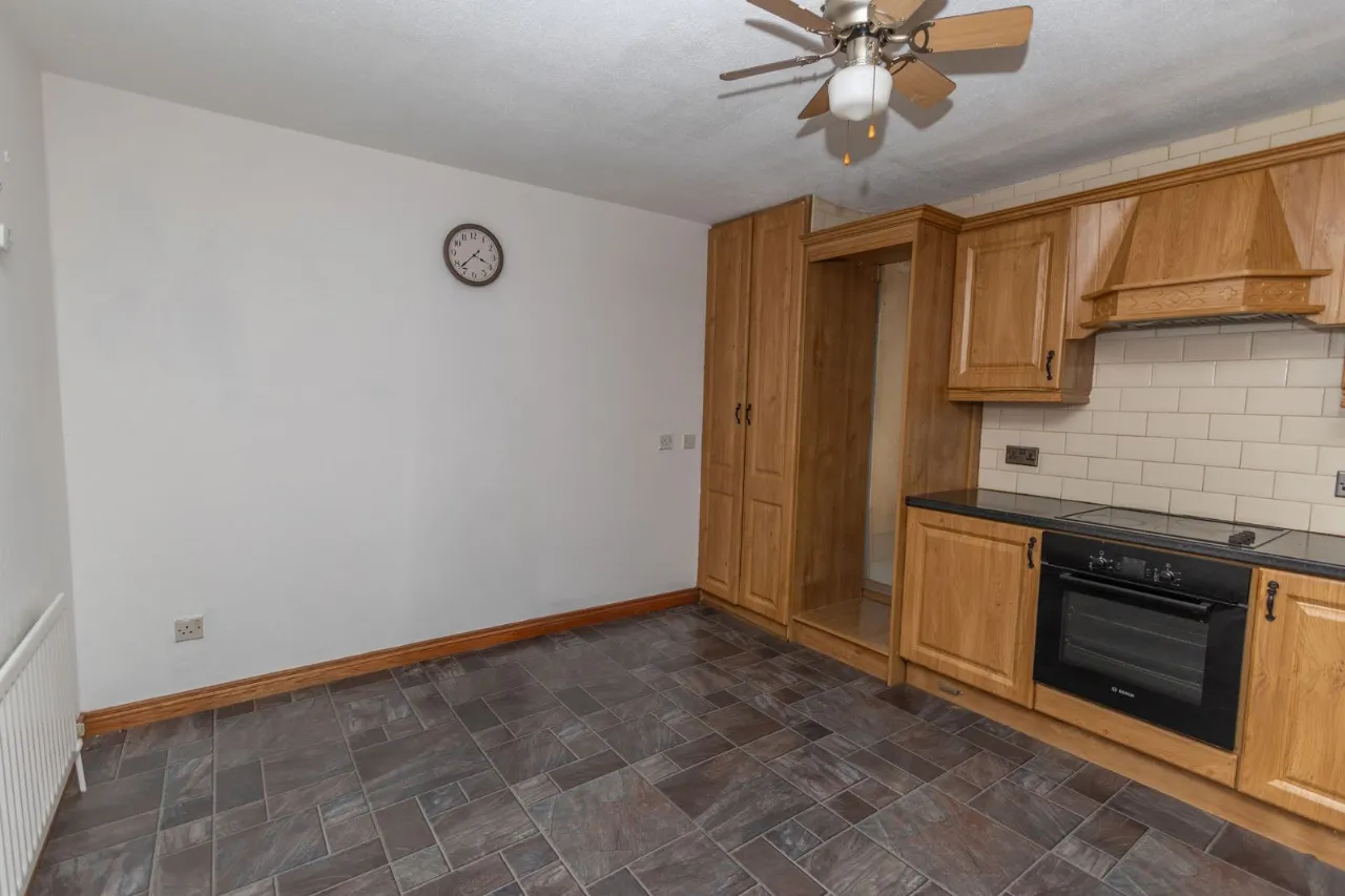 Range of high and low level units. Stainles steel sink unit with mixer taps. Hob, oven and extractor fan. Plumbed for washing machine. Tiled flooring and partly tiled walls. Double radiator