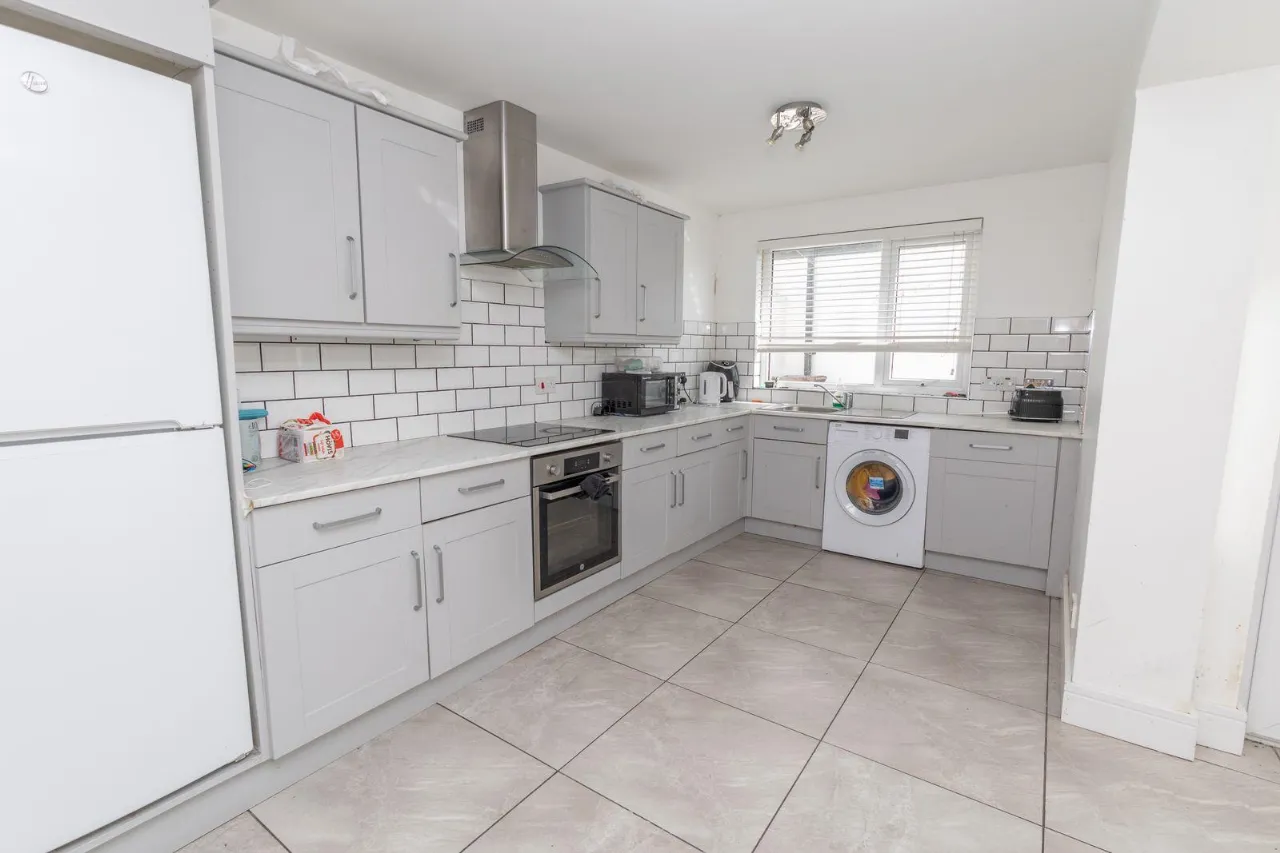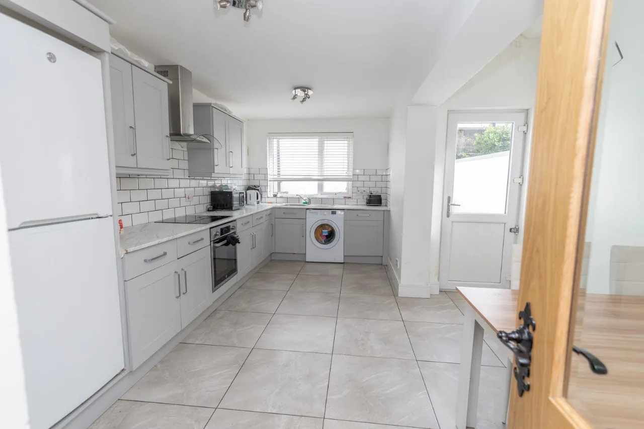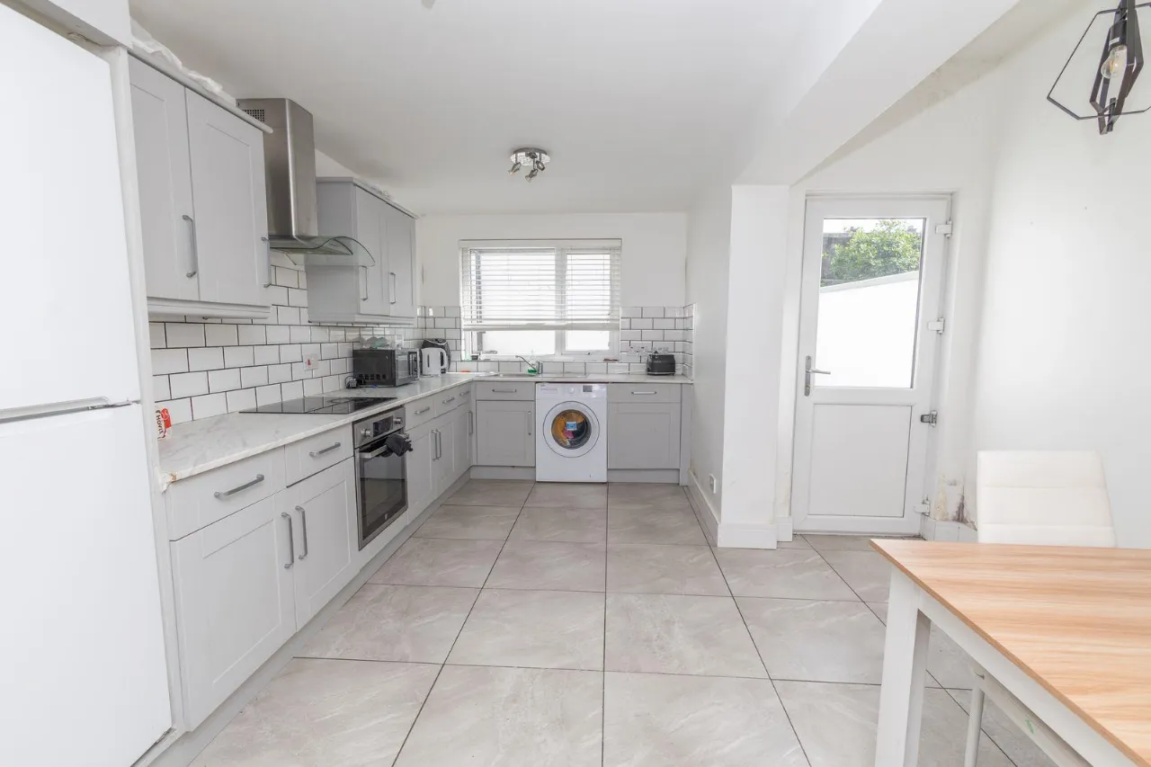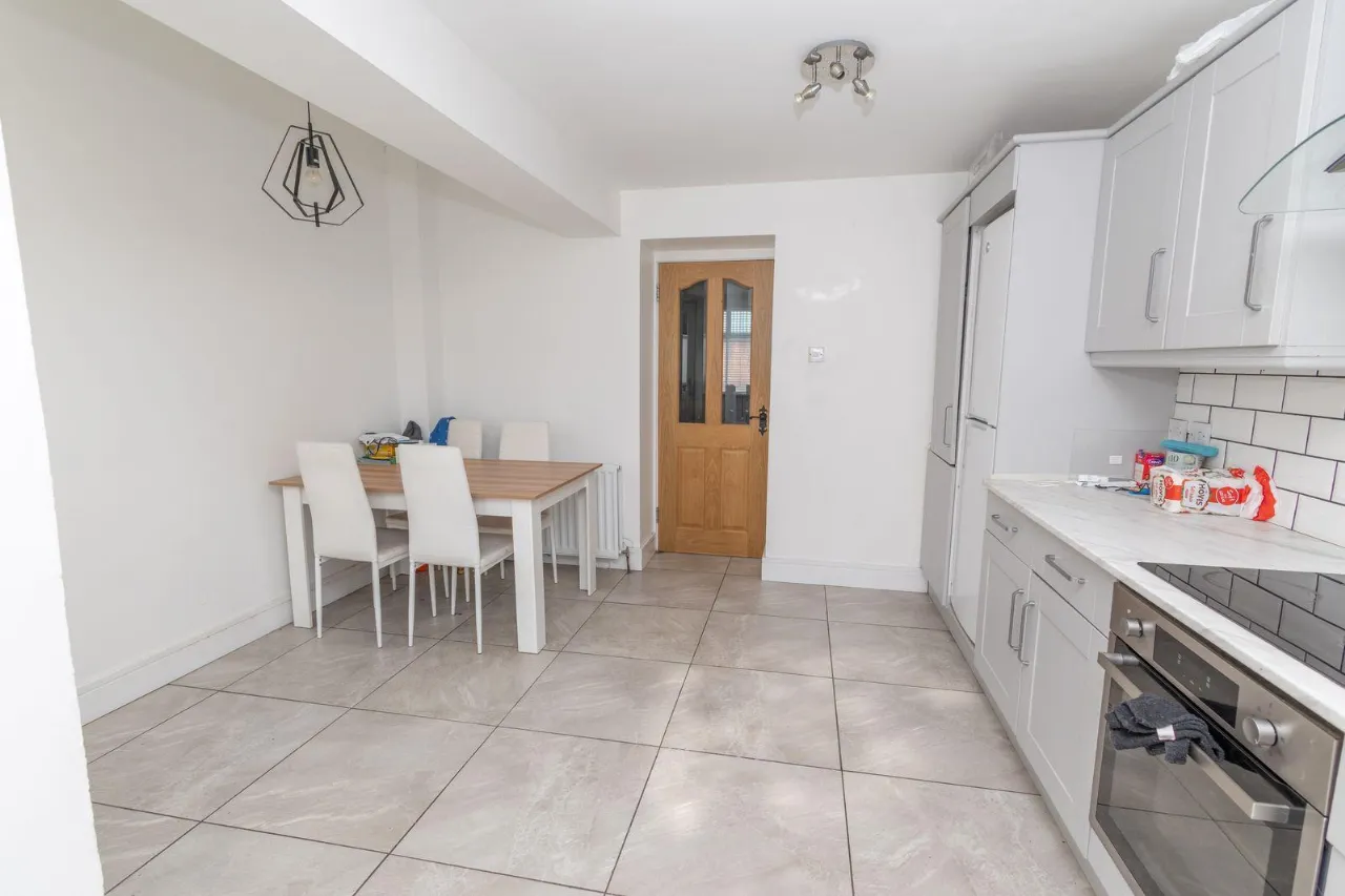 Range of high and low level units. Tiled flooring. Hob, oven and extractor fan. Stainless steel sink unit with mixer tap. Partial tiled walls. Plumbed for washing machine. Double radiator. USB Charger. PVC rear door leading onto small rear yard
