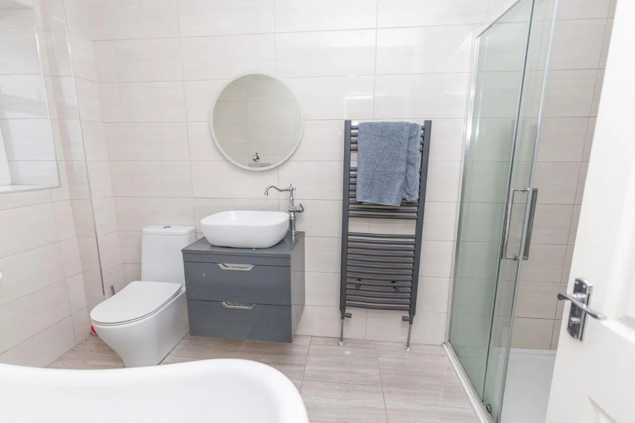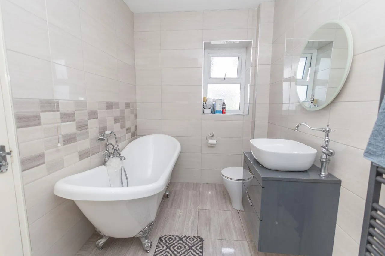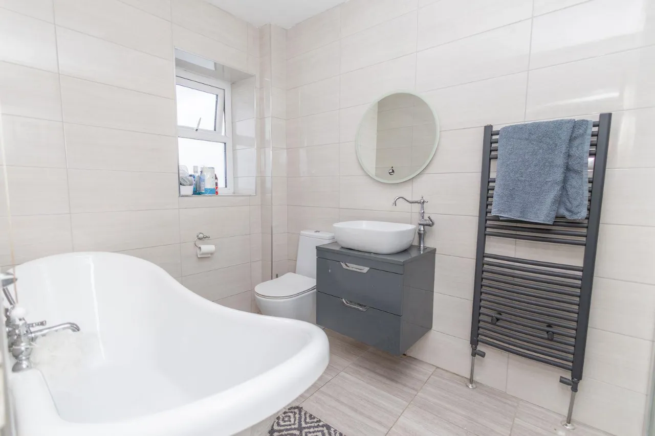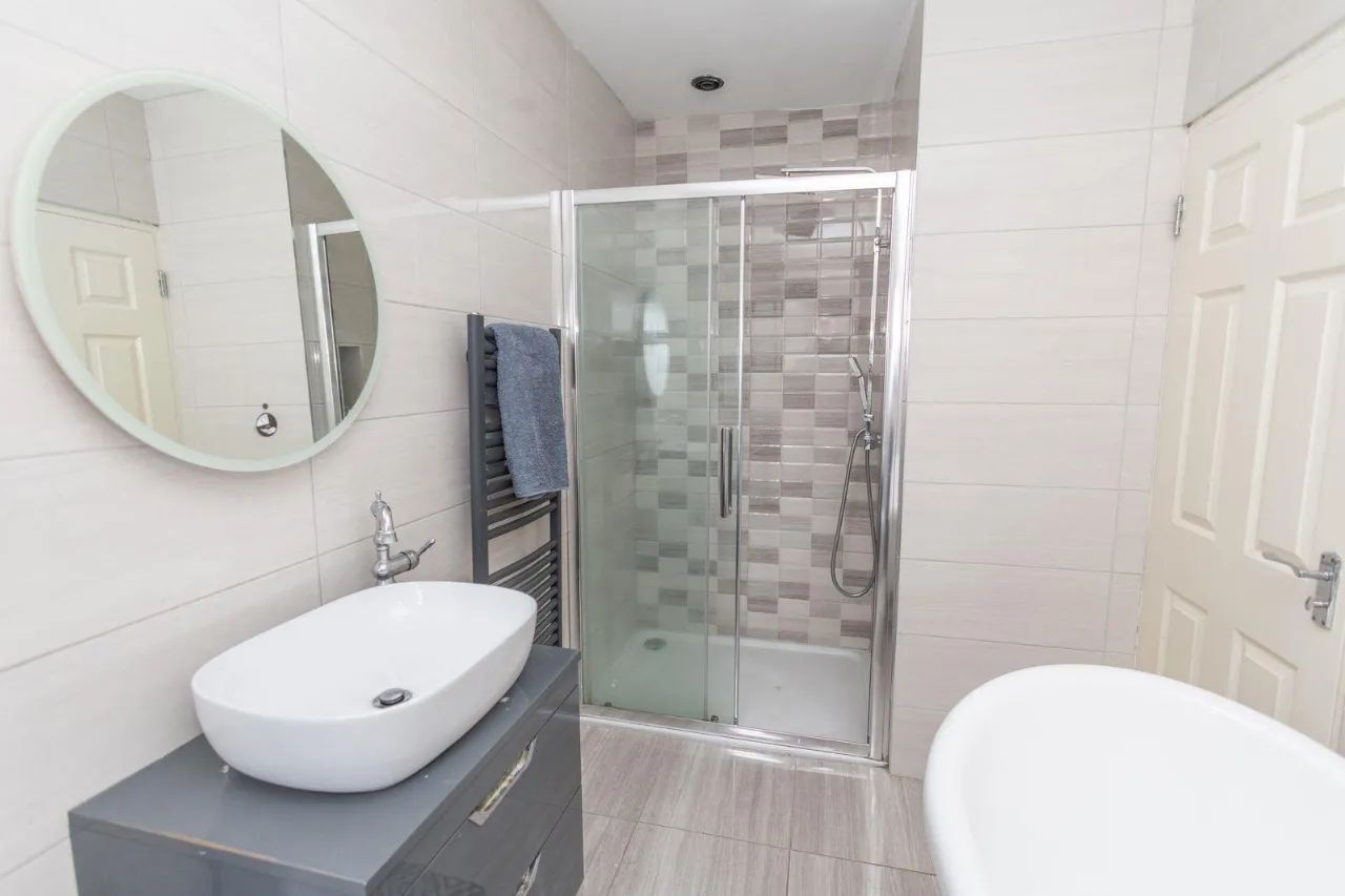 Fully tiled bathroom. Free standing bath with mixer taps and shower attachment. Wash hand basin with Storage drawers underneath, W.C. Walk in shower with high pressure shower head. Towel rail. Wall mounted mirror with led light surround