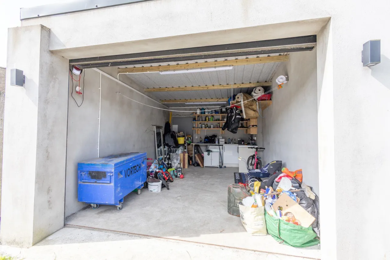 The garage is located to rear of property. Electric roller door. Cement flooring. Stainless steel sink unit with mixer taps. Storage cupboards, shelving. 4 double sockets,