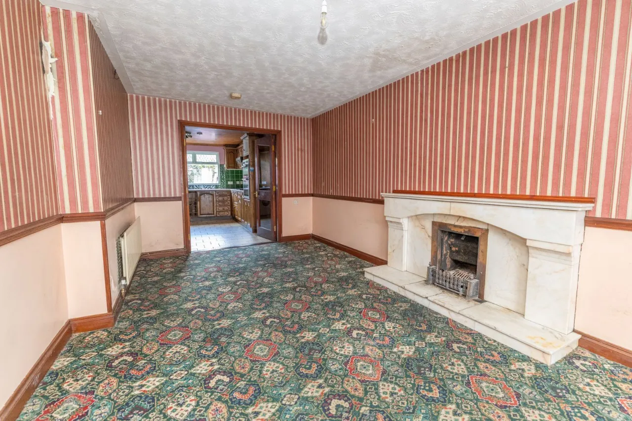 Carpet flooring. Open fire with marble surround and marble hearth. T.V. point. 2 double radiators