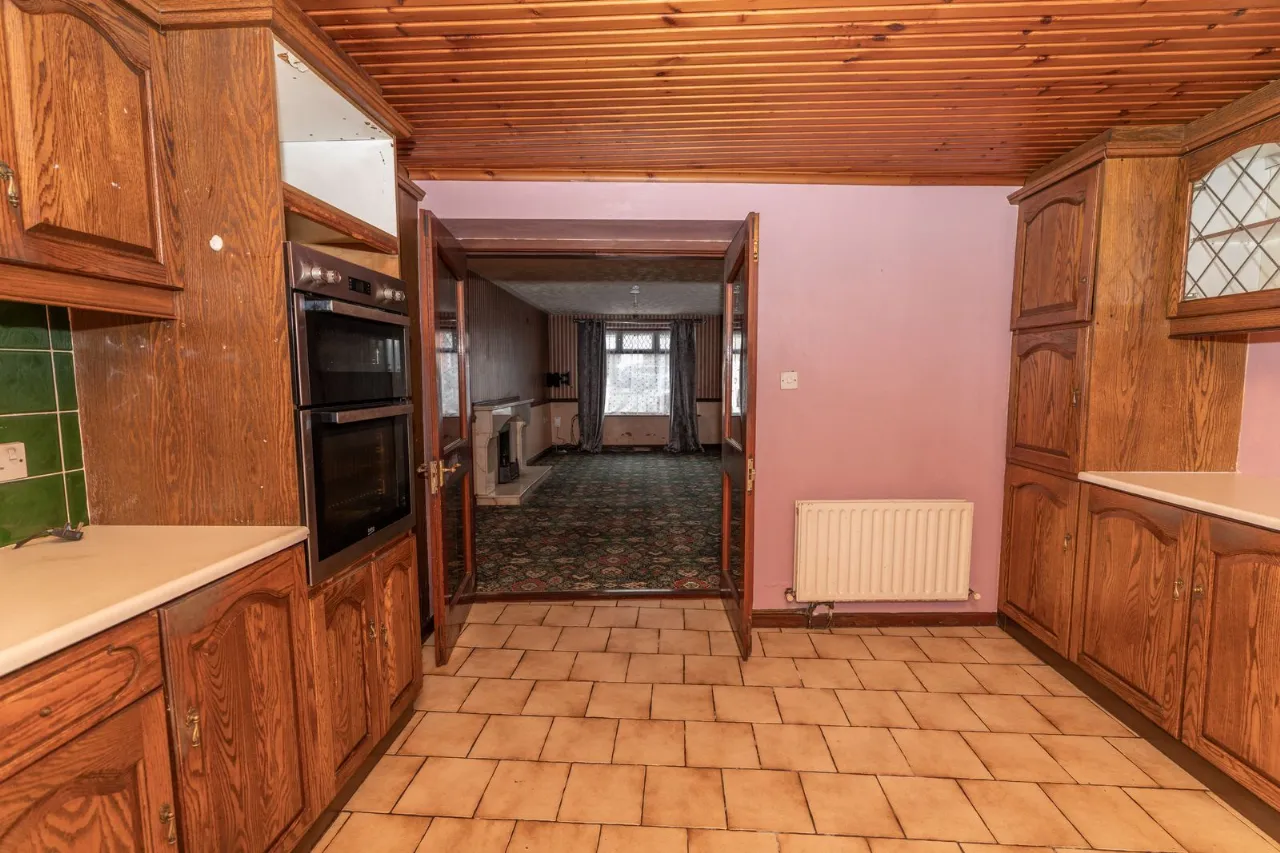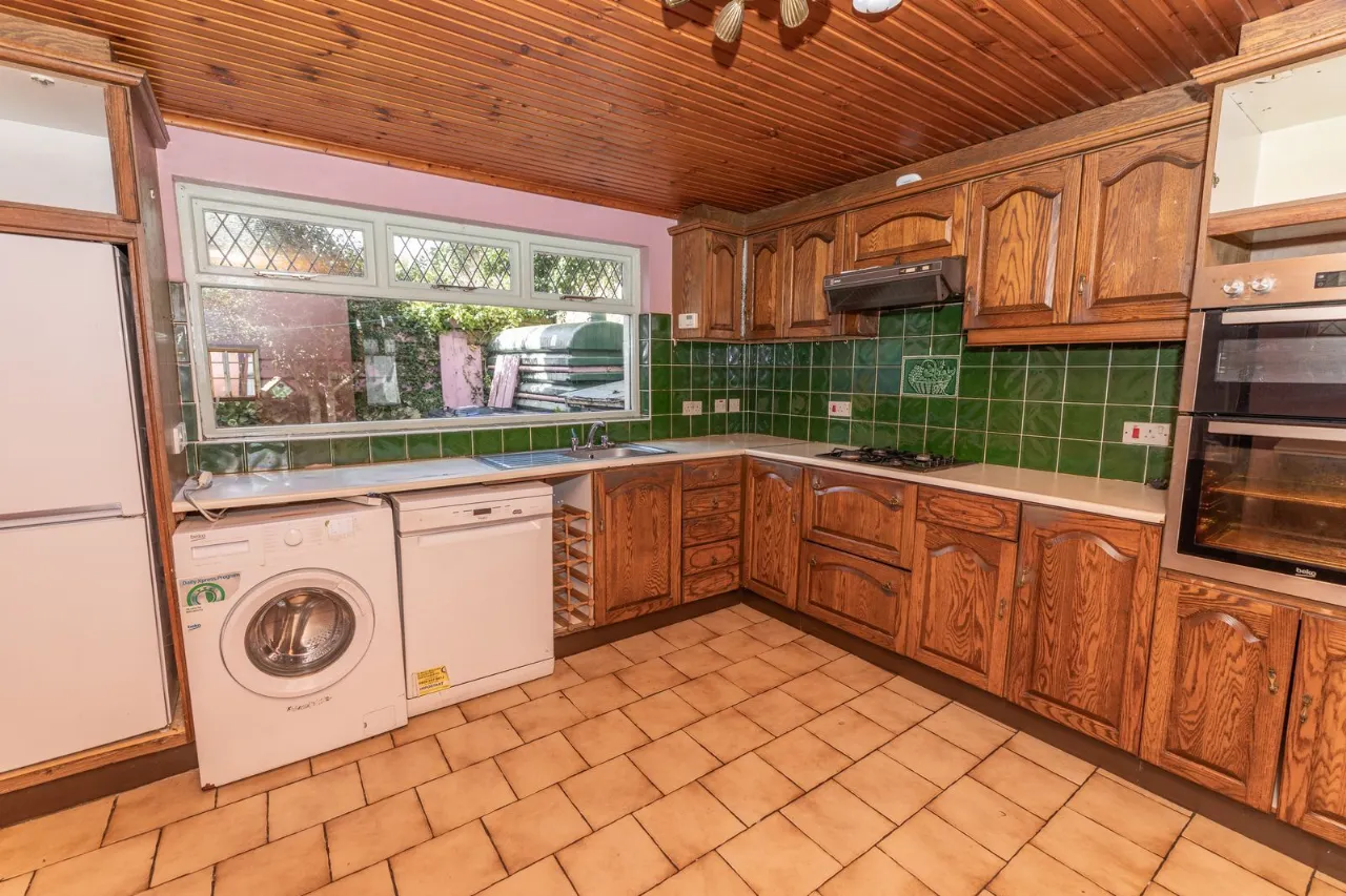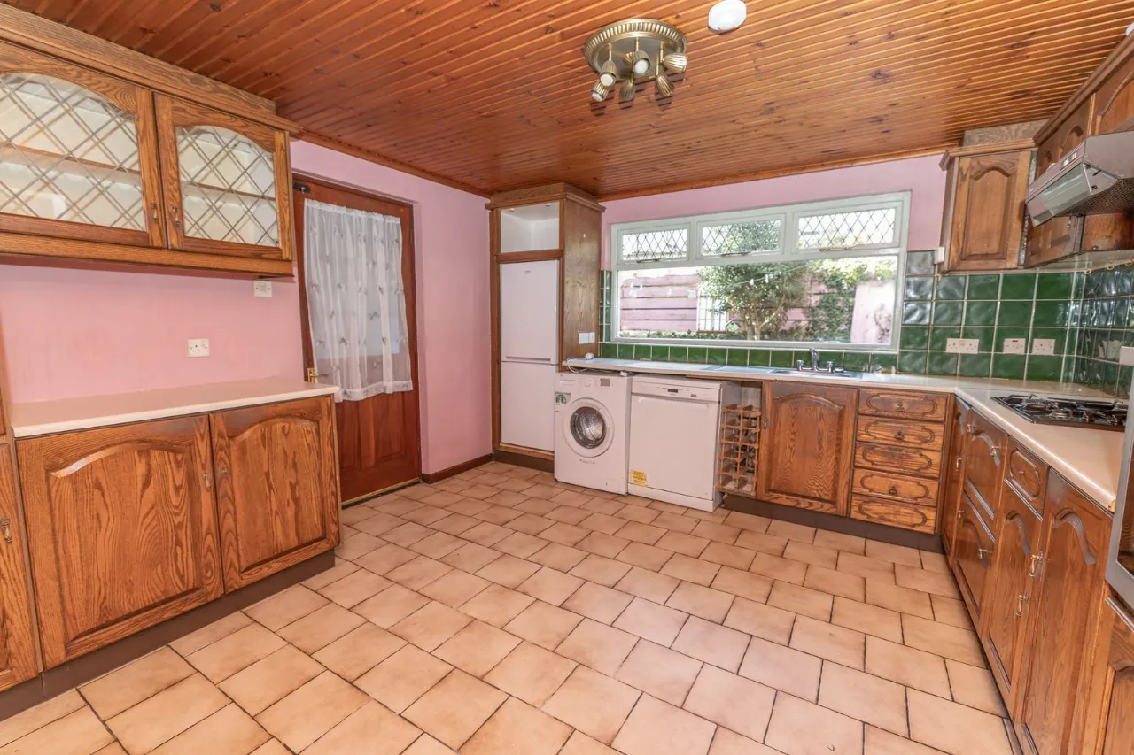 Range of high and low level units. Plumbed for washing machine. Stainless steel sink unit with mixer tap. Gas hob, electric oven and extractor dan. Tiled floorng. Partly tiled walls