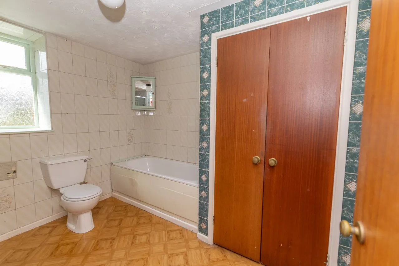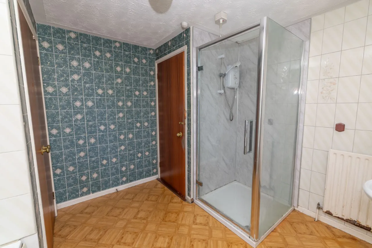 3 piece bathroom suite. Walk-in electric shower. Linoleum flooring. Partly tiled walls. Hotpress