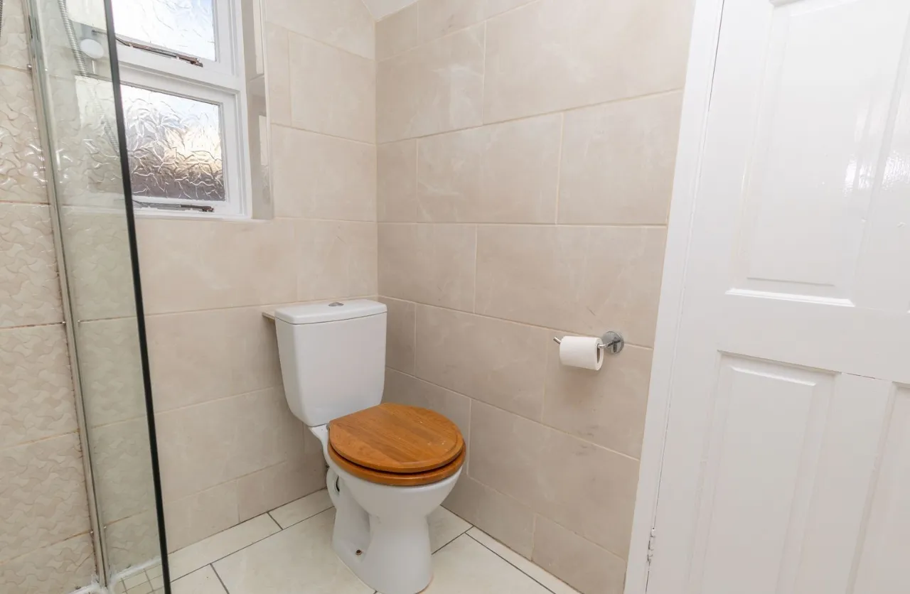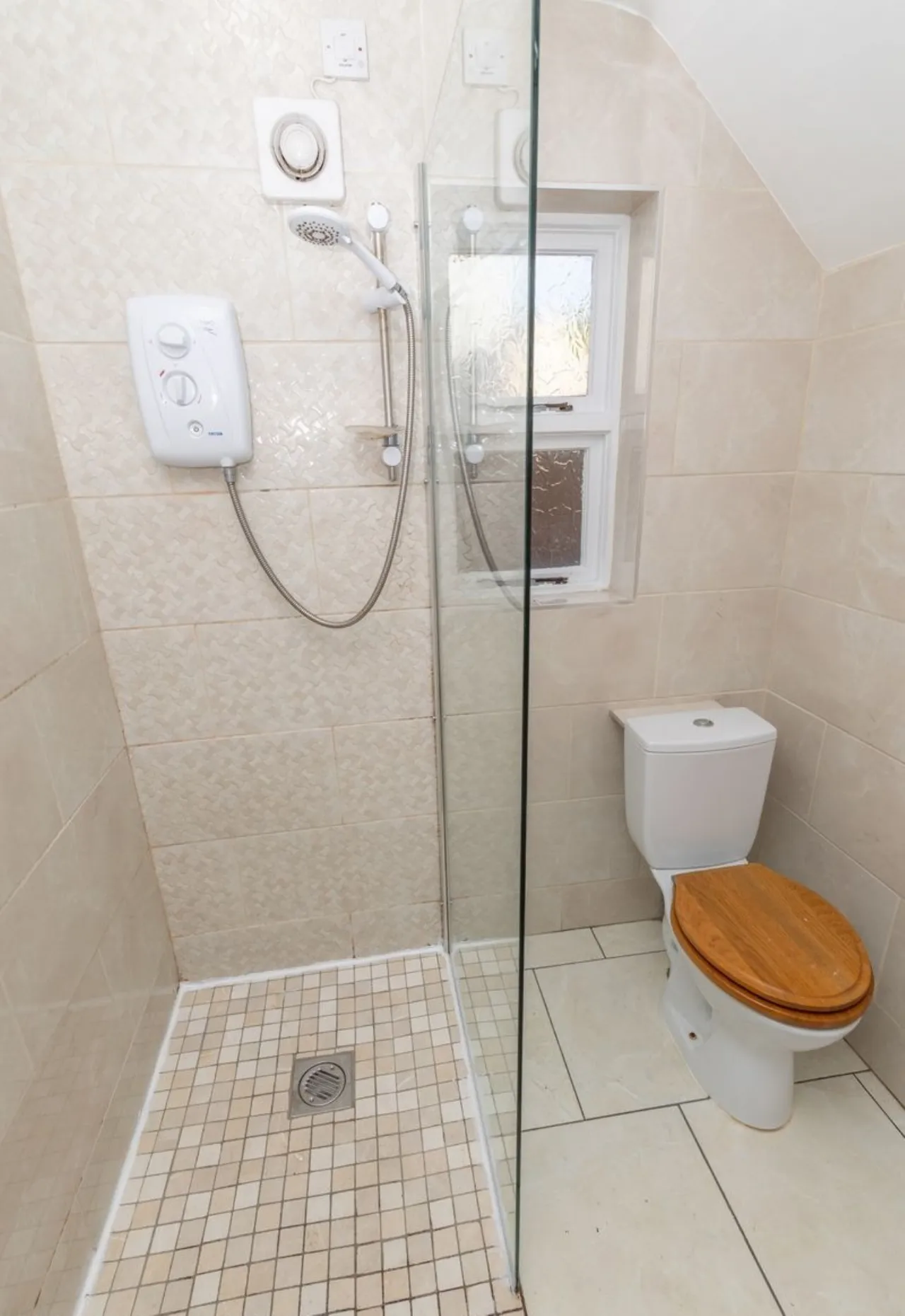 Walk in electric shower. Toilet and wash hand basin. Small storage cupboard under sink. Wall mirrored cabintt Tiled flooring and fully tiled walls.