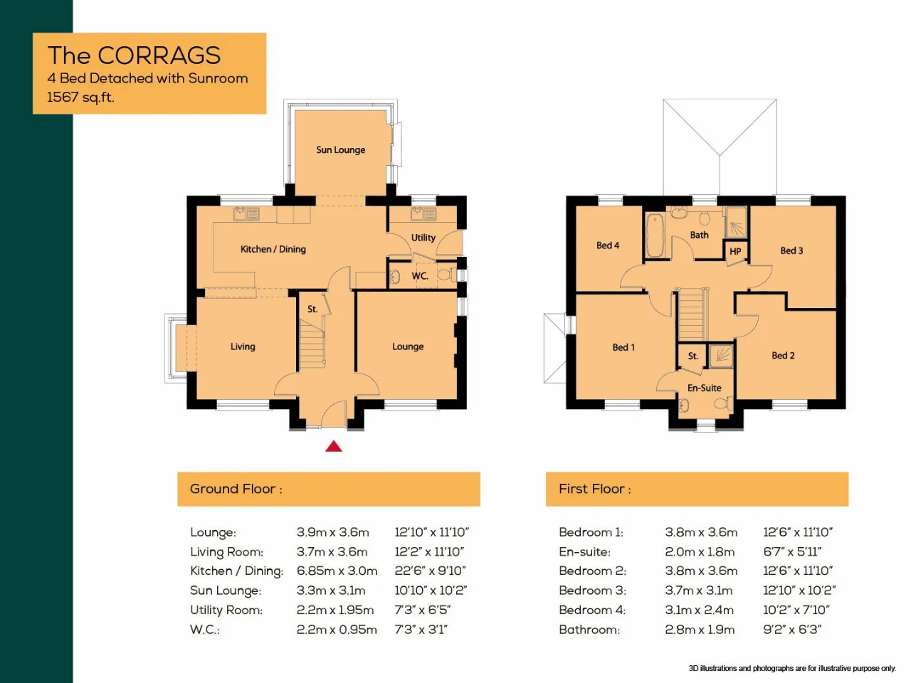 Choice of ceramic floor tiling to kitchen, dining area, utility, bathroom, ensuite and WC.