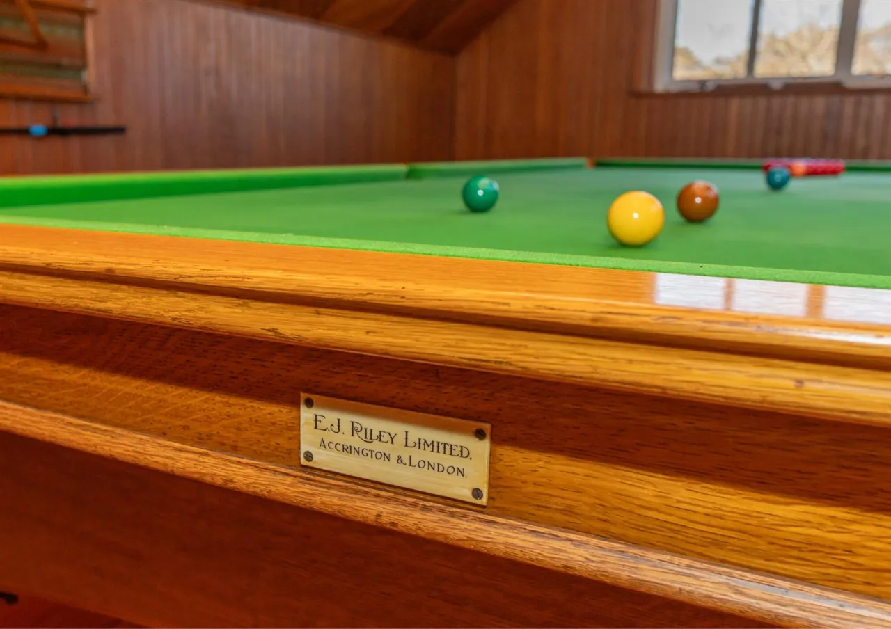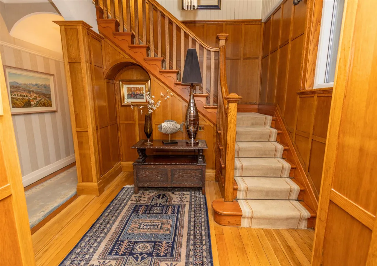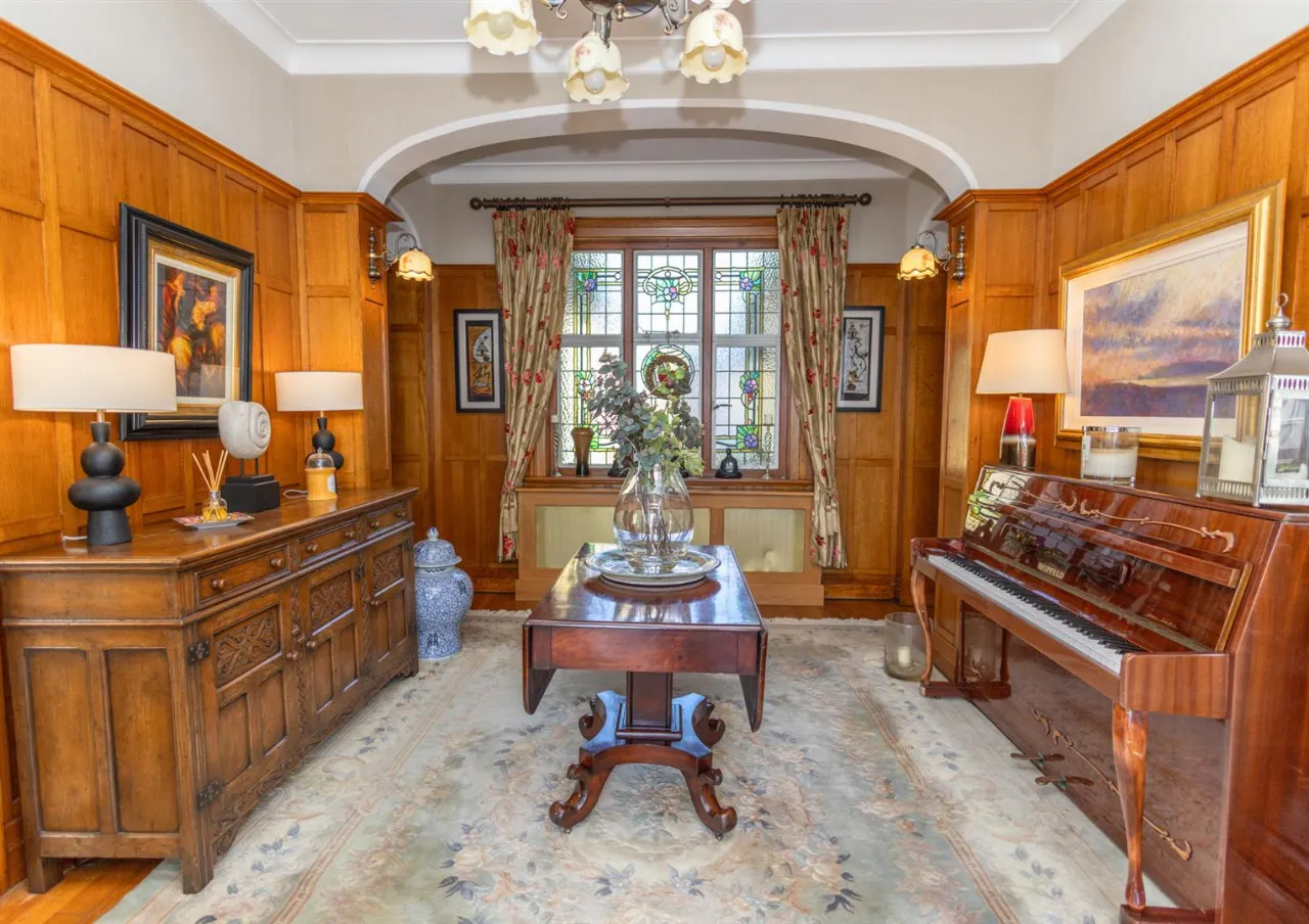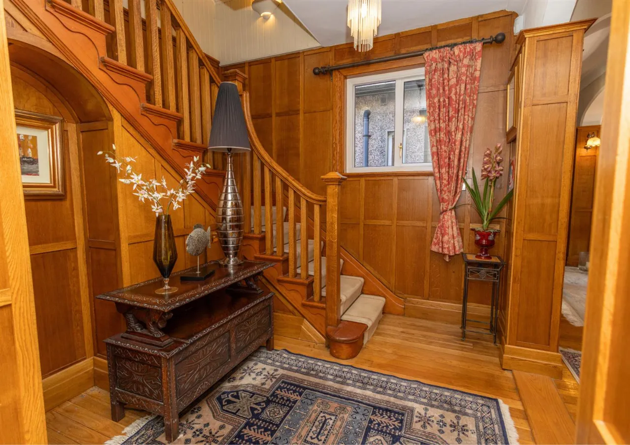 Solid wood flooring and wall panelling. Feature stained glass