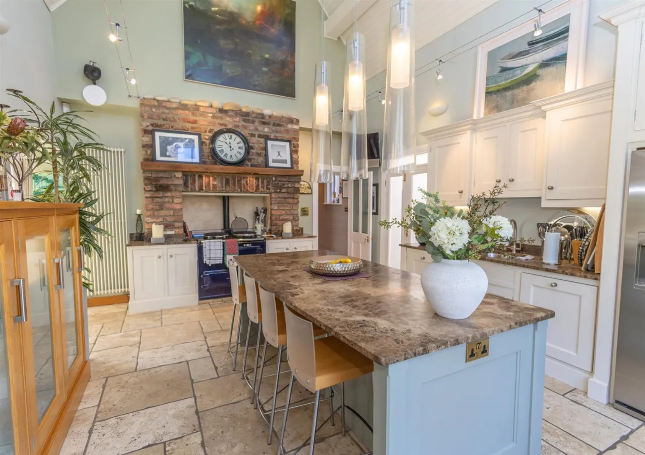 Oil fired Aga with reclaimed Belfast Brick Chimney. Central island