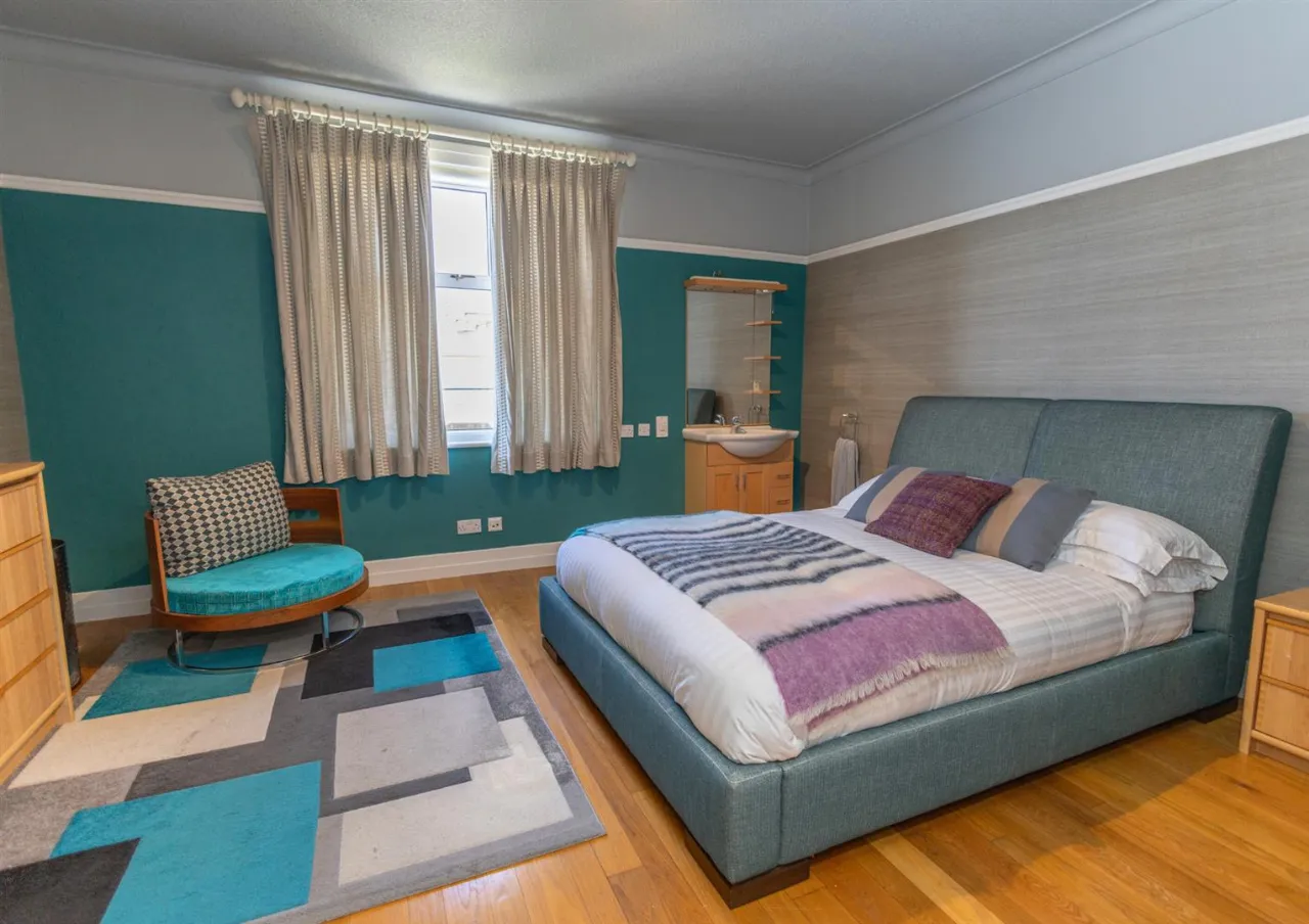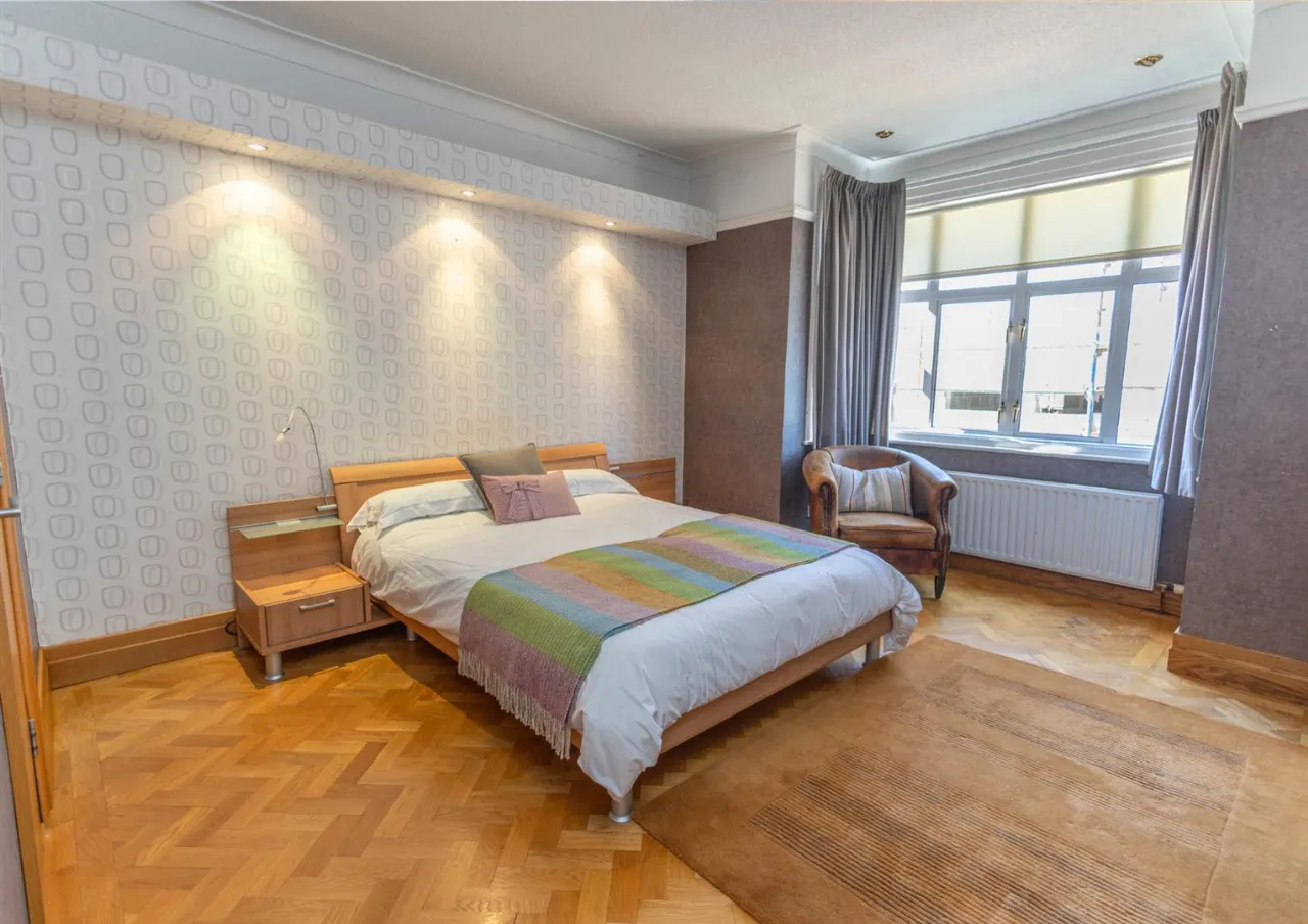 flooring. Bay window. Adjoining ensuite with shower and sink.