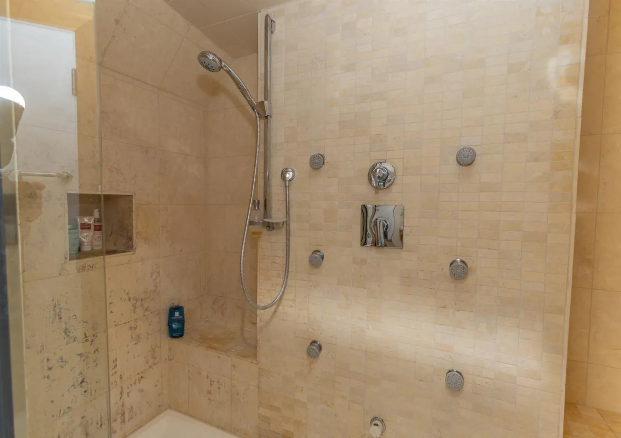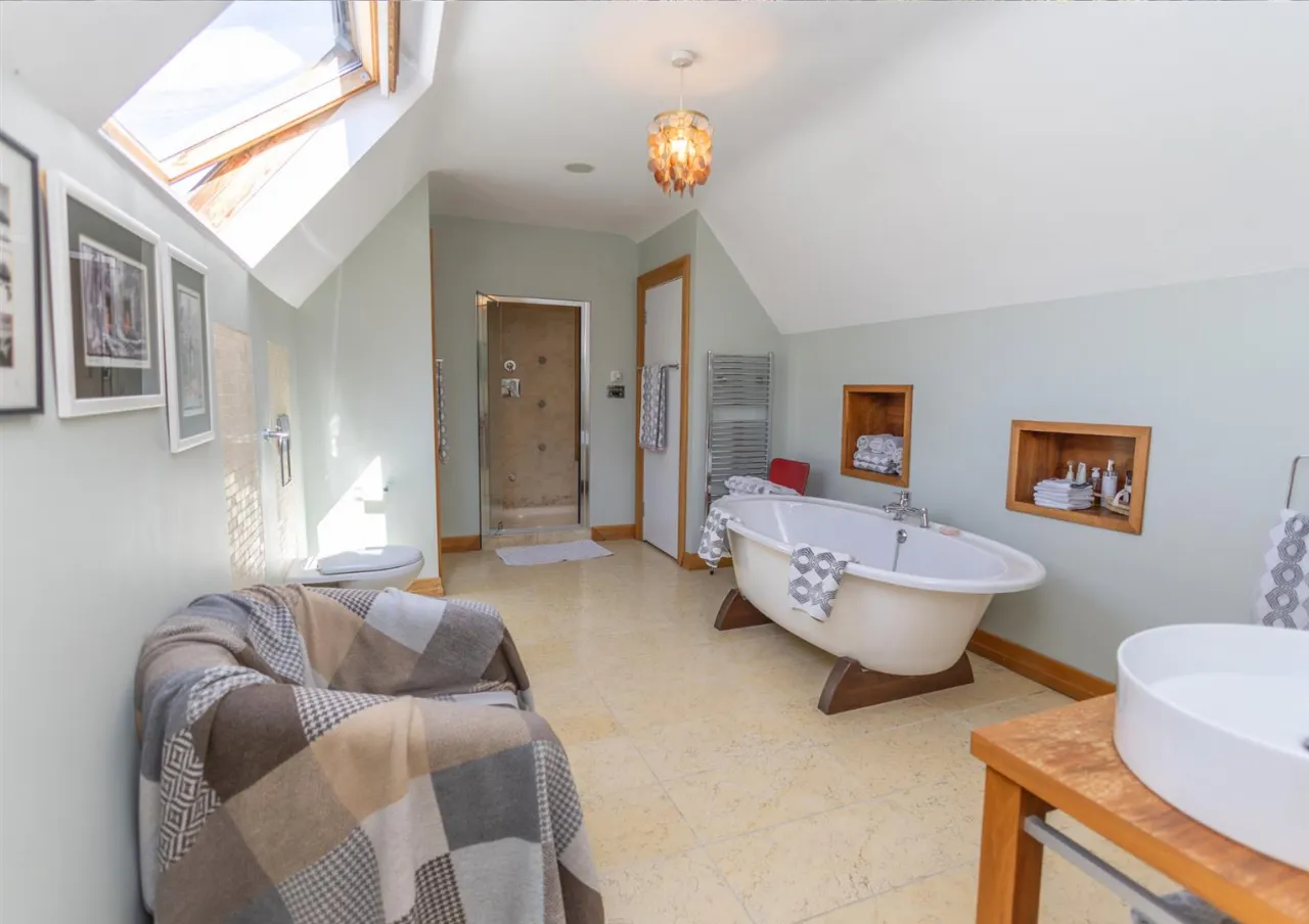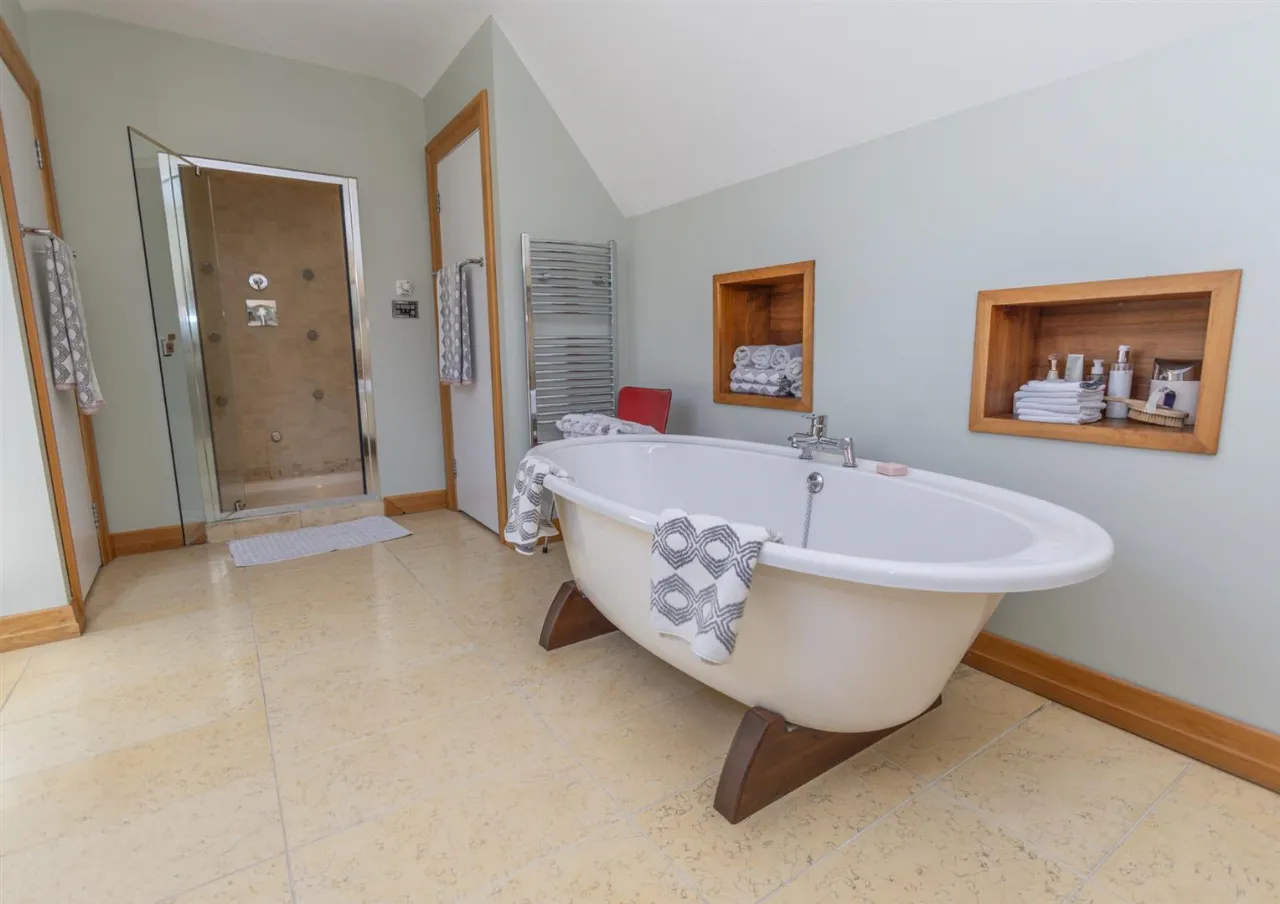 Tiled flooring. ¾ high wood panelling to walls. Double sized walk in