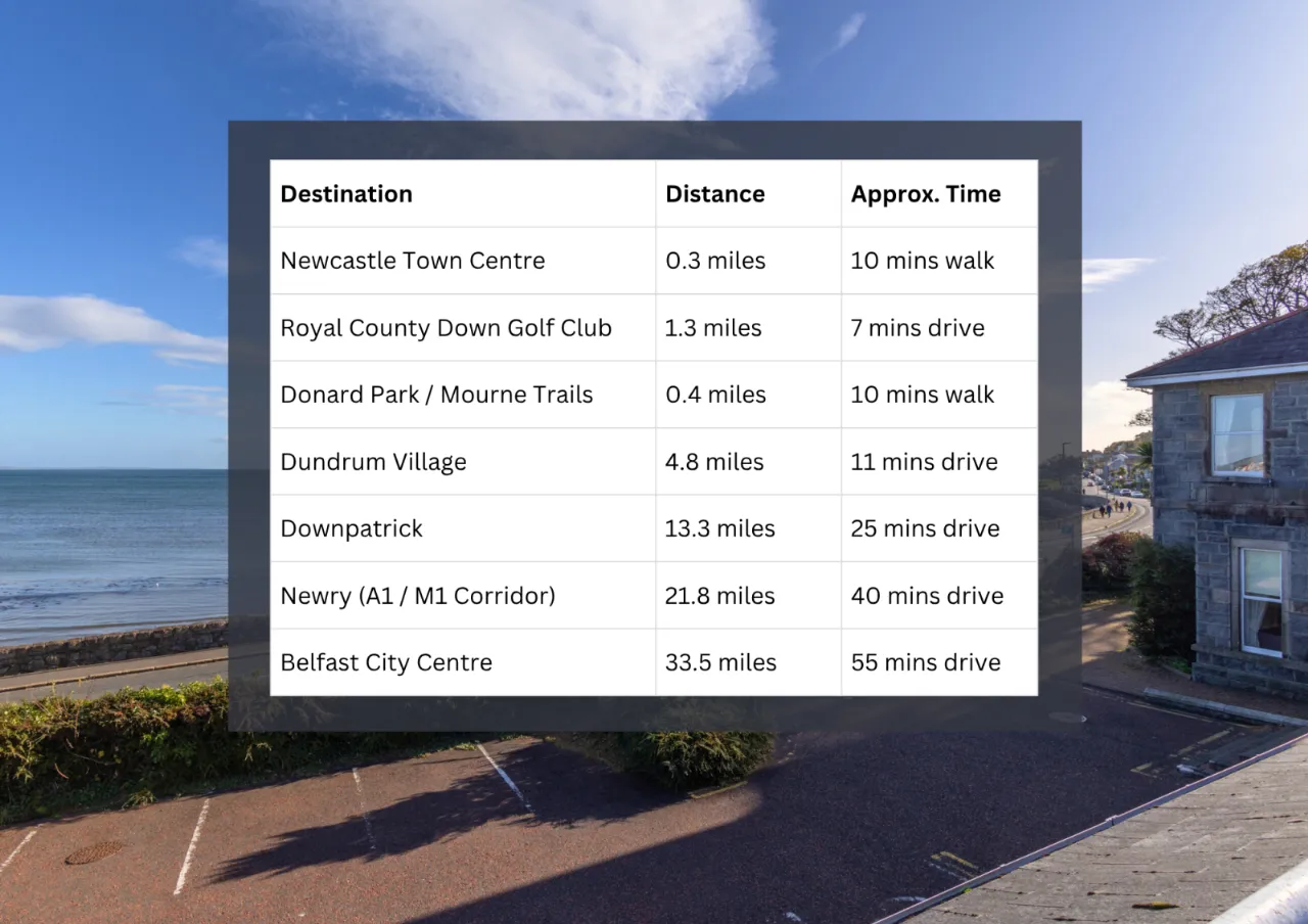 Newcastle is a long-established tourism and residential destination, approximately 30 miles south of Belfast and 20 miles east of Newry, easily reached via the A24 dual carriageway and A2 coastal route. The town benefits from strong year-round trade, supported by Royal County Down Golf Club, Donard Park, and a growing number of boutique hotels, cafés, and leisure venues.