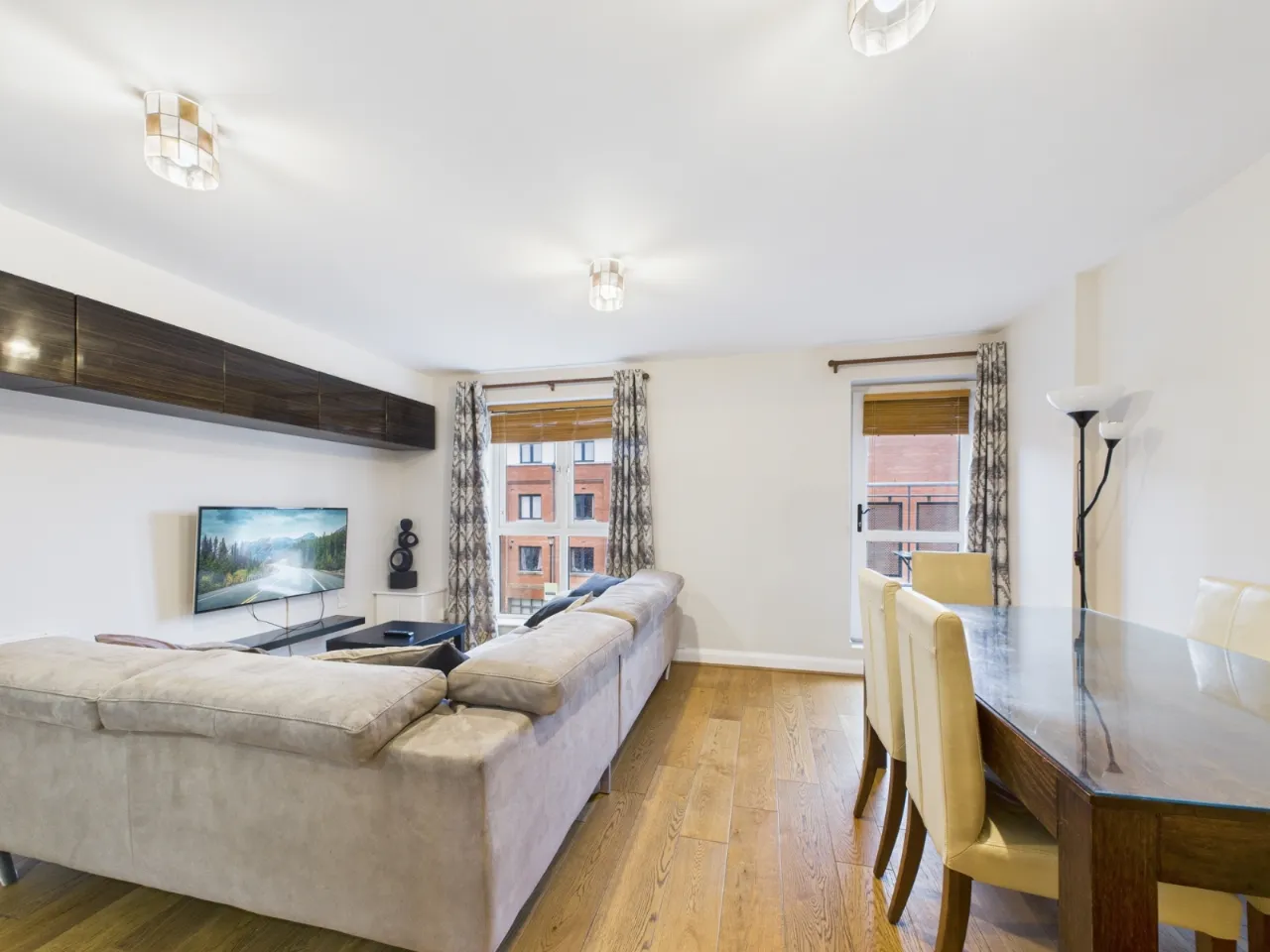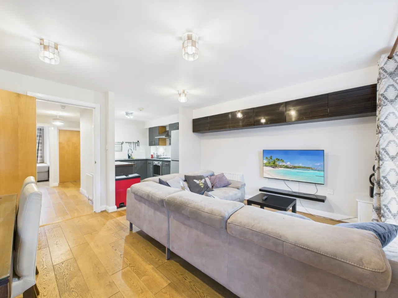 The apartment features three generously sized bedrooms, all furnished and filled with natural light. There are two modern bathrooms, including a private en-suite off the master bedroom and a main bathroom with stylish fittings. The bright and comfortable living room provides the perfect space to relax or entertain, while the fully fitted kitchen comes equipped with modern appliances, ample storage, and a dining area for everyday use. large windows throughout create a welcoming and airy atmosphere.