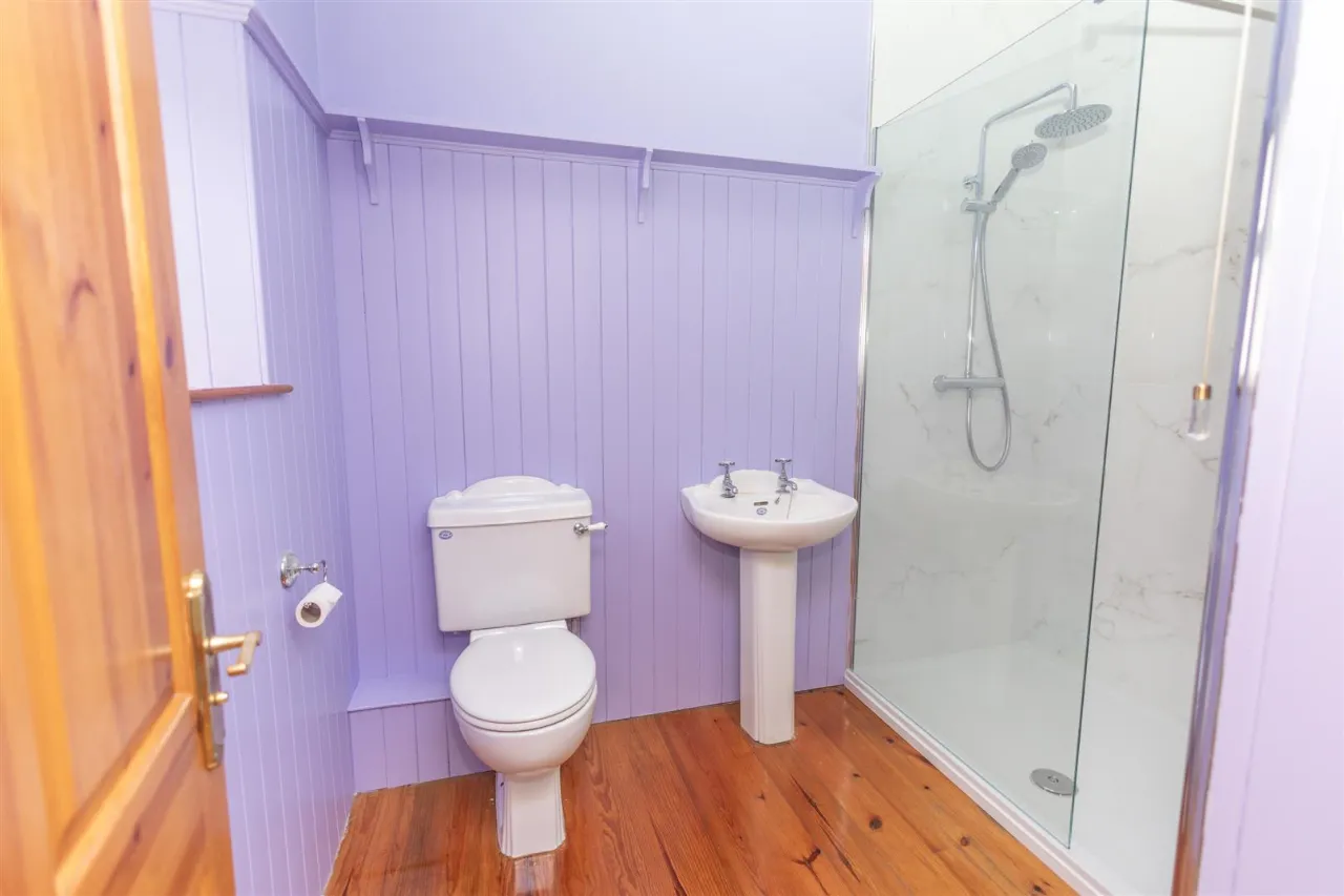 Wooden flooring. Wooden panels on walls with high shelf. Low flush wc. Pedestal sink. Walk in shower with rain fall shower head. Wall mounted chrome radiator.