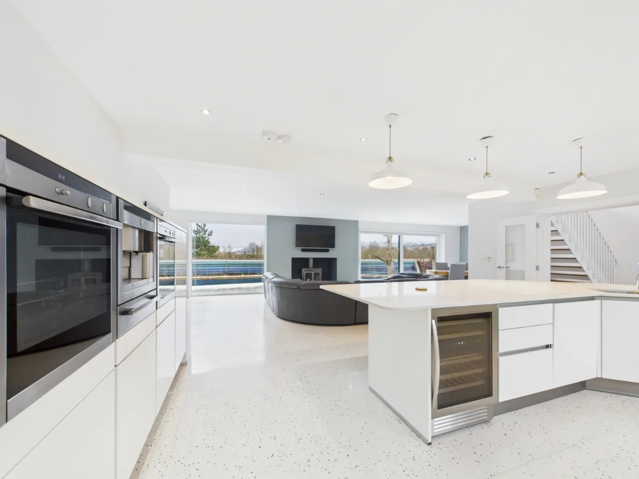The property offers bright, spacious accommodation throughout. The ground floor features a striking open-plan kitchen, living and dining area with floor-to-ceiling windows overlooking the golf course, a separate living room, double bedroom with ensuite, downstairs WC, utility room, and an integral garage with shower room.