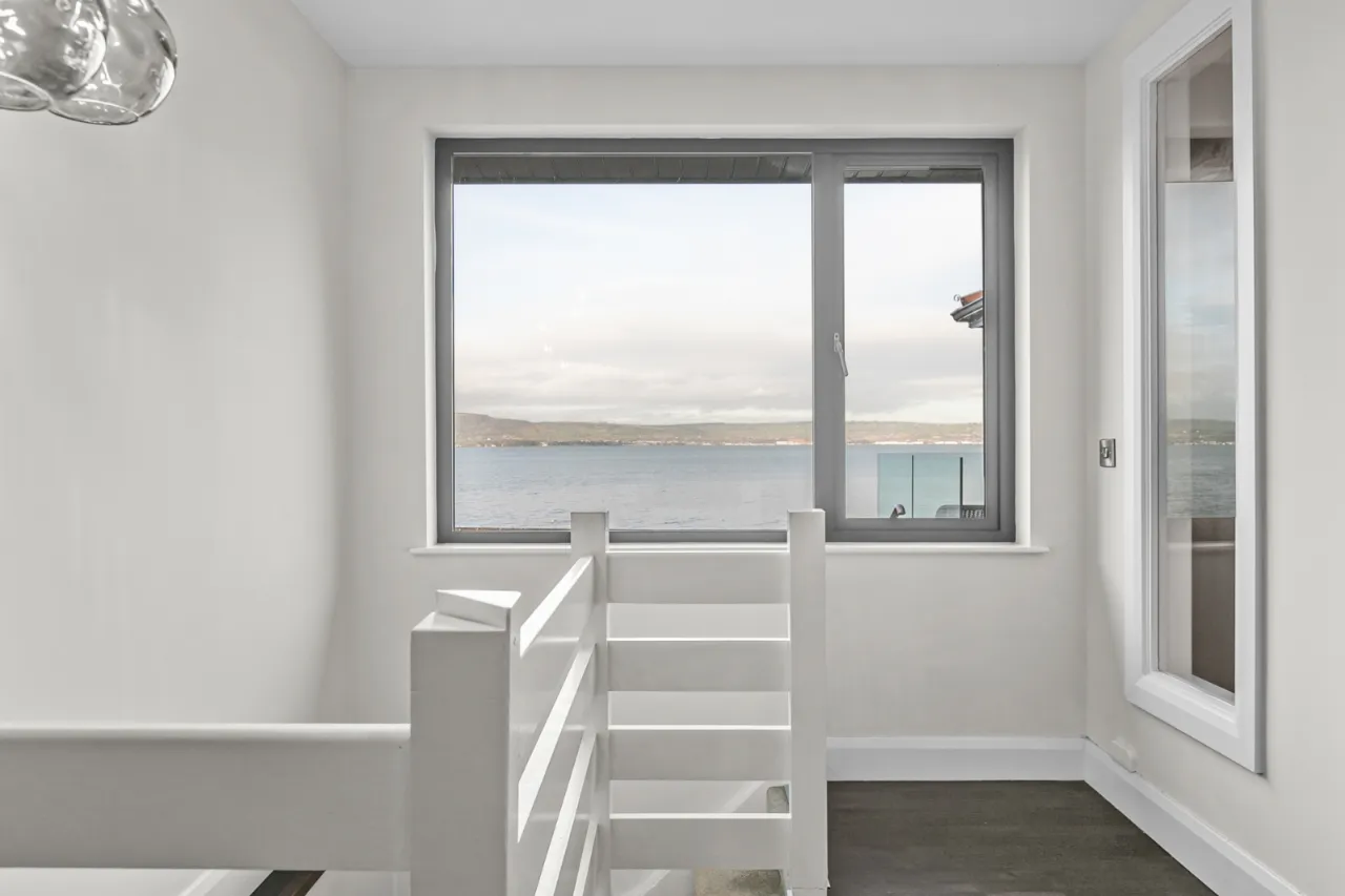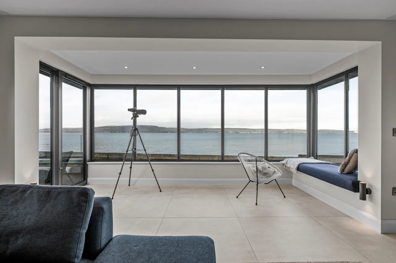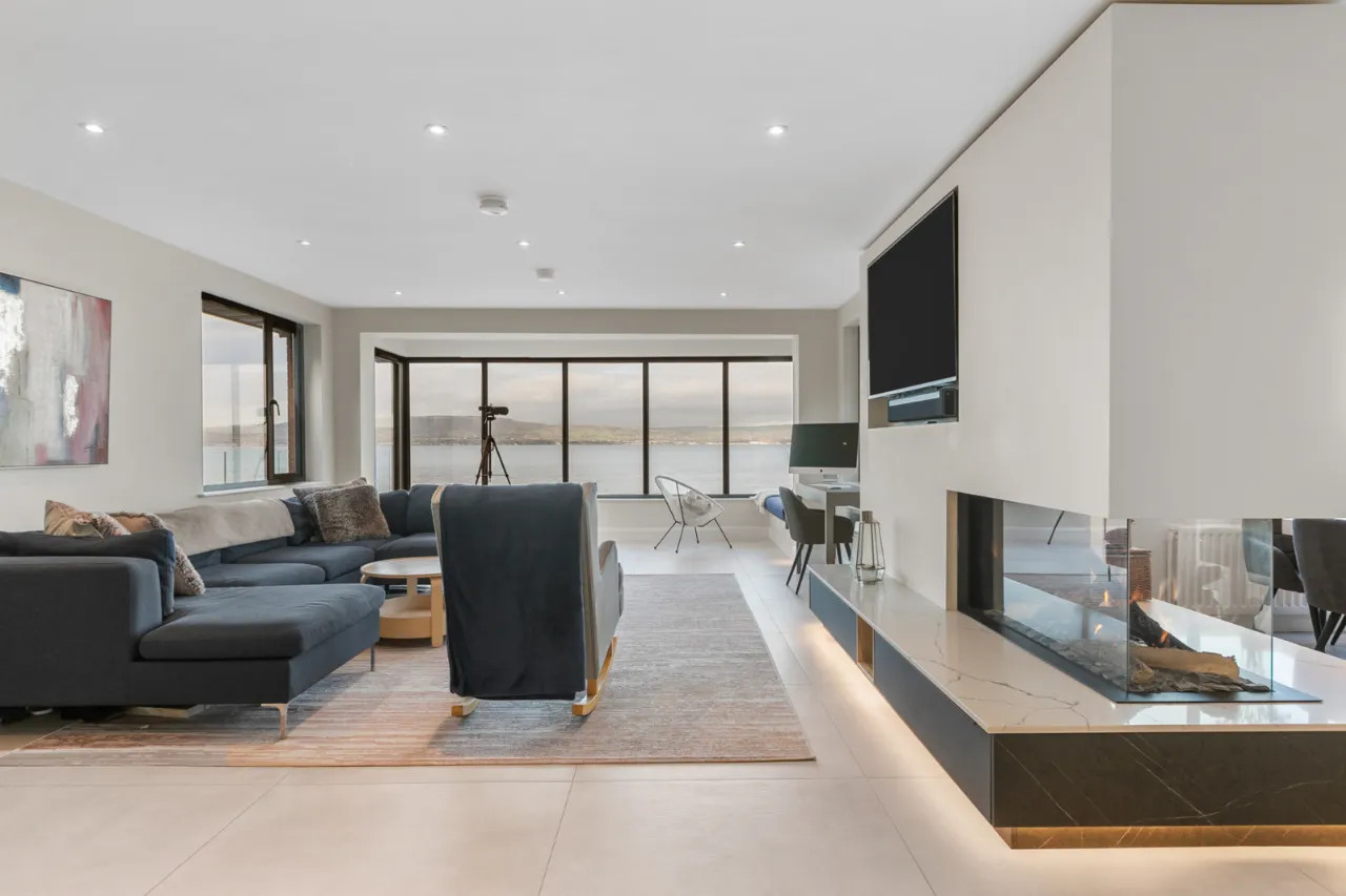 Contemporary double sided gas fire to kitchen and dining, sliding doors to balcony, window seating, panoramic sea views, low voltage spot lights, tiled floor.