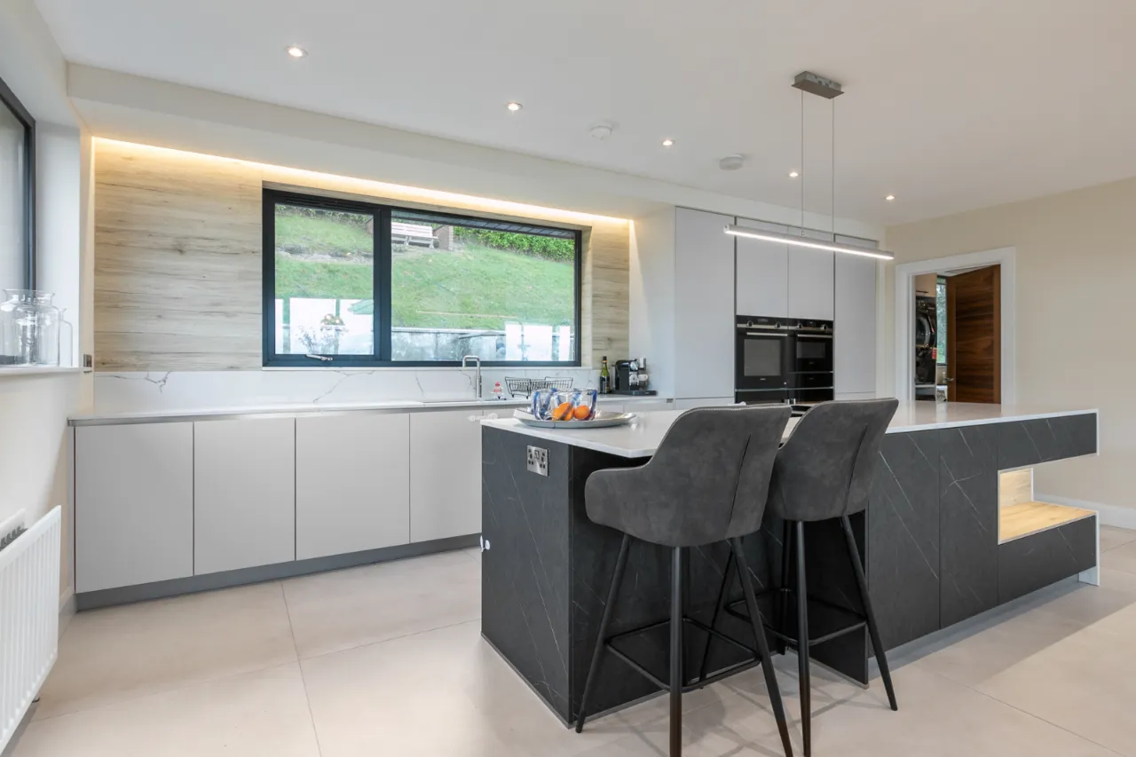 Modern fully fitted kitchen with excellent range of high and low level units, quatz worktops and upstand, large island, 1.5 bowl sink unit with Quooker hot water tap, integrated dishwasher, integrated fridge freezer, integrated double combi oven with plate warmer, integrated twin fridge. Dining area, uPVC double glazed door to raised terrace with panoramic sea views, tiled floor throughout.